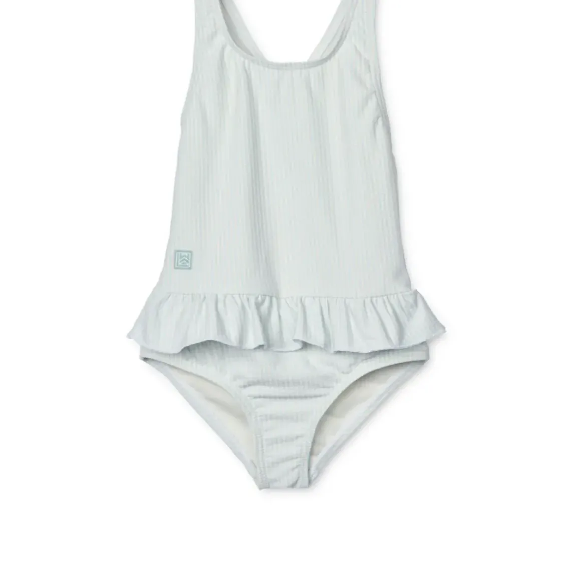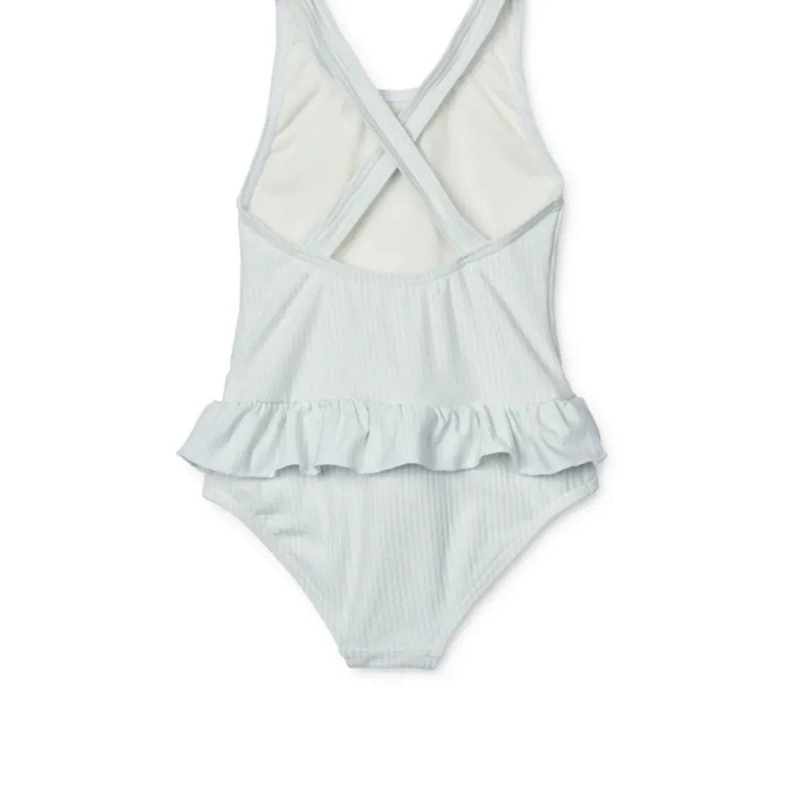 Lad dit barn hoppe I poolen eller I bølgen blå med vores stribede Amara badedragt. Den populære badedragt har fine detaljer som flæser ved taljen og krydsede stropper bagpå.