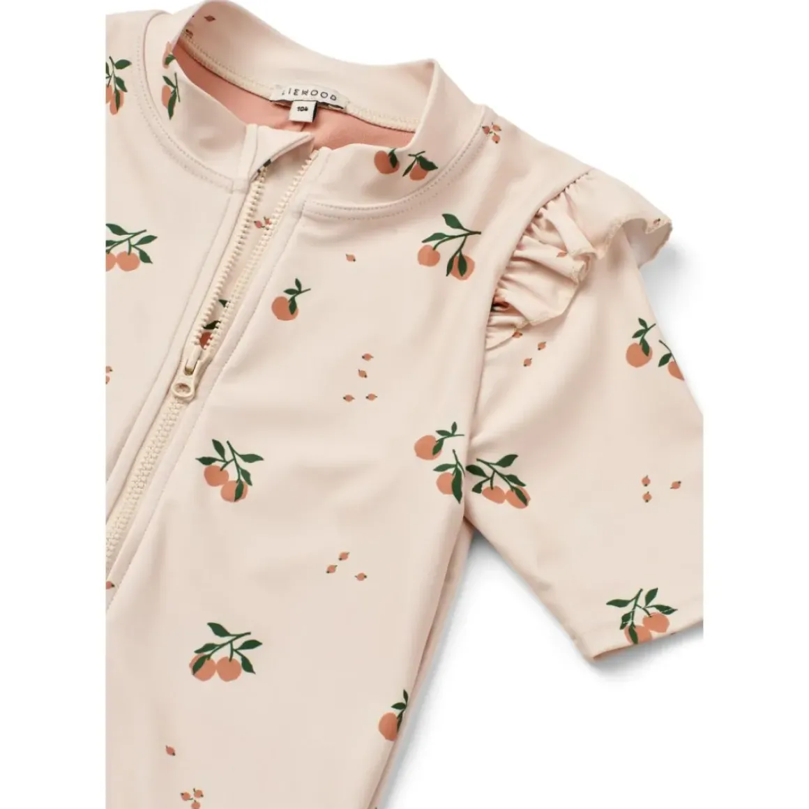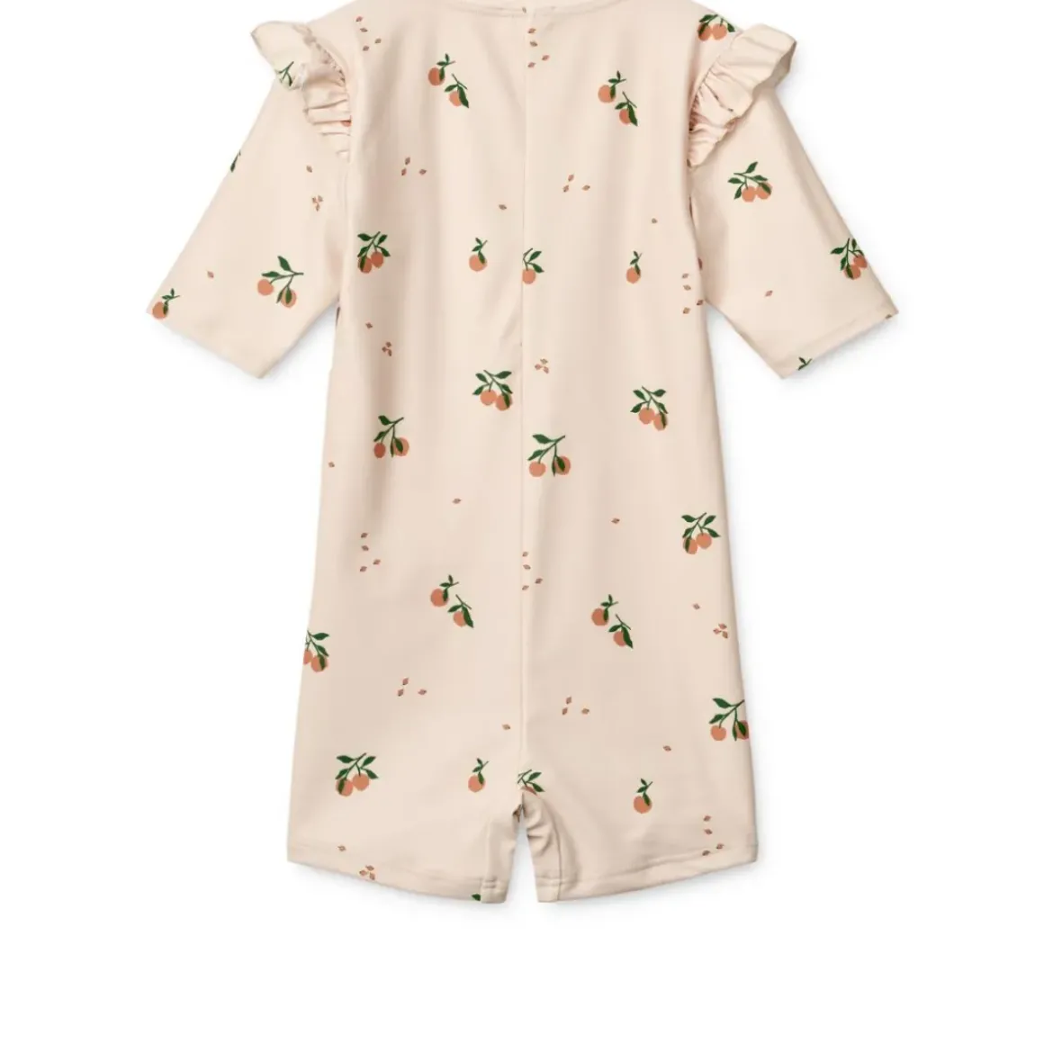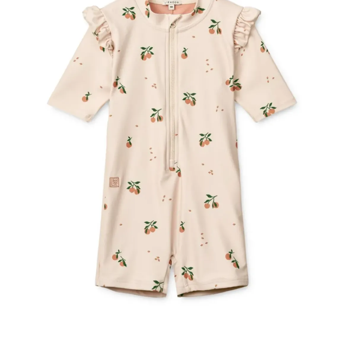 Den fine Amel-svømmedragt kombinerer UV-beskyttelse med dekorative detaljer og sommerlige farver, som gør den til det ideelle valg til solrige dage ved stranden eller poolen. Svømmedragten er fremstillet af hurtigtørrende genanvendt polyester og har en lynlås foran, så de små nemt og hurtigt kan tage den på.