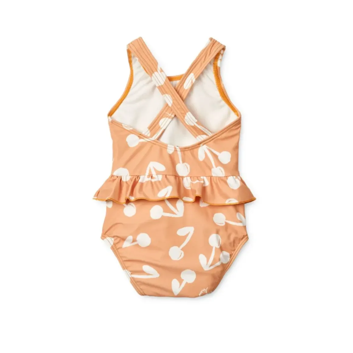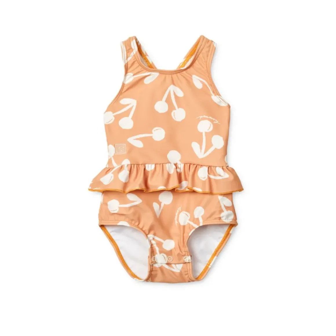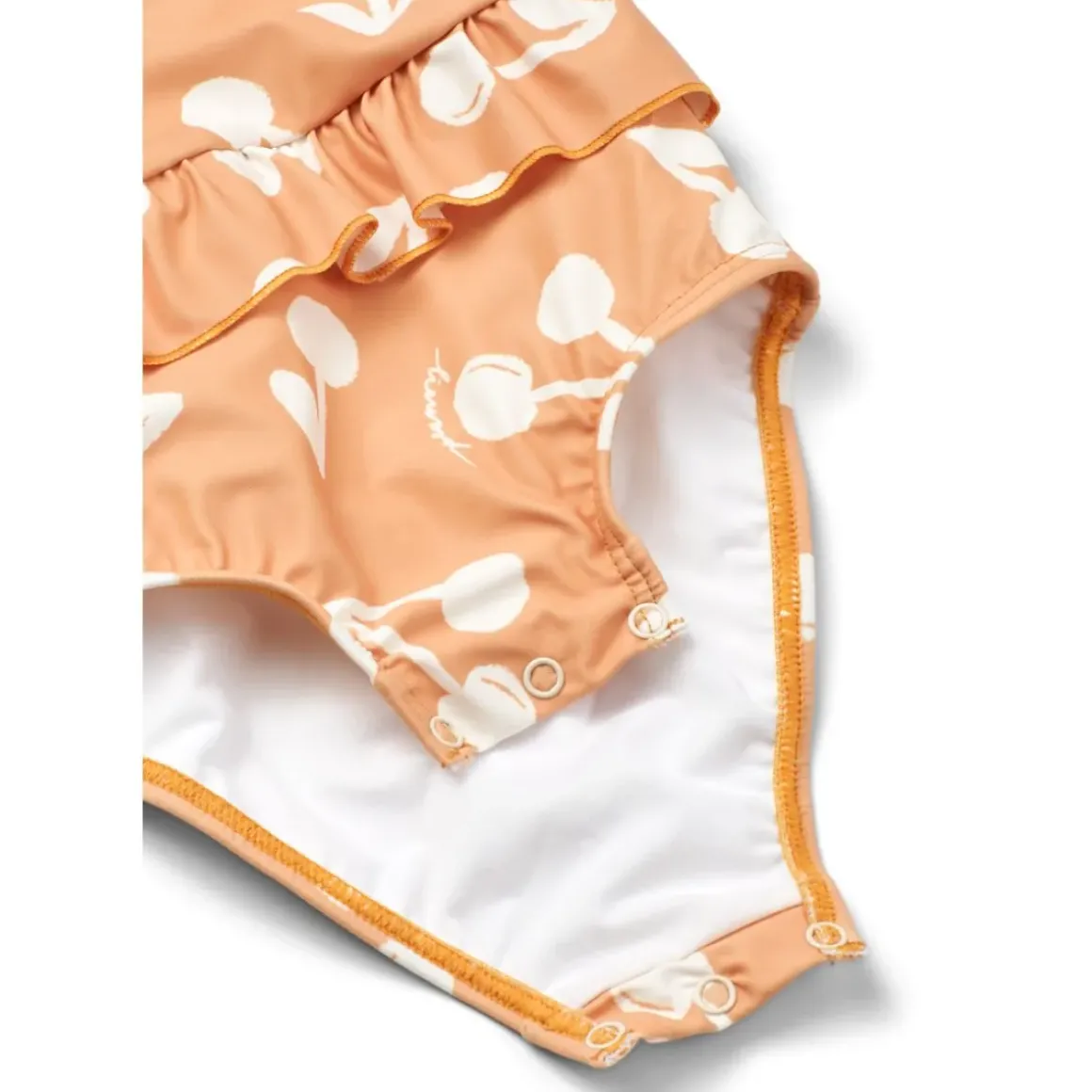 Amina babybadedragten har fine detaljer som flæserne ved taljen, krydsede stropper bagpå og praktiske trykknapper I bunden. Den beskytter den tildækkede hud mod solen når den lille øver sig i at plaske i vandet.