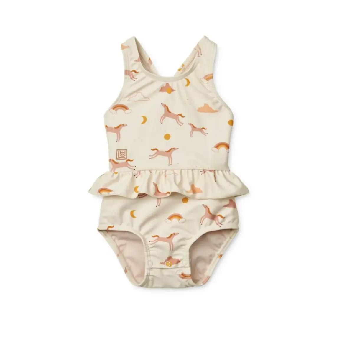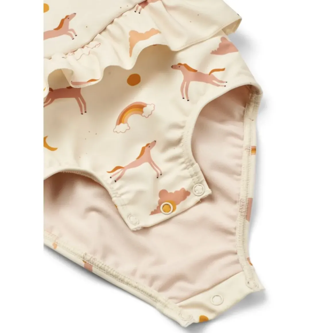 Amina babybadedragten har fine detaljer som flæserne ved taljen, krydsede stropper bagpå og praktiske trykknapper I bunden. Den beskytter den tildækkede hud mod solen når den lille øver sig i at plaske i vandet.
