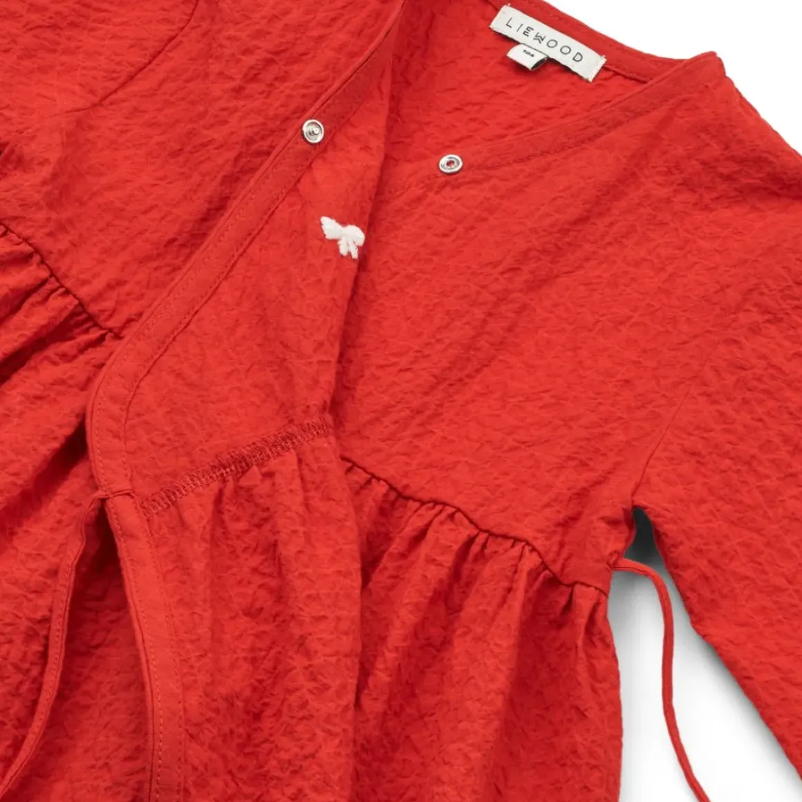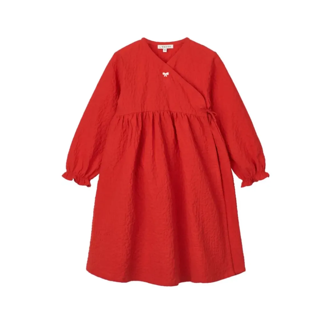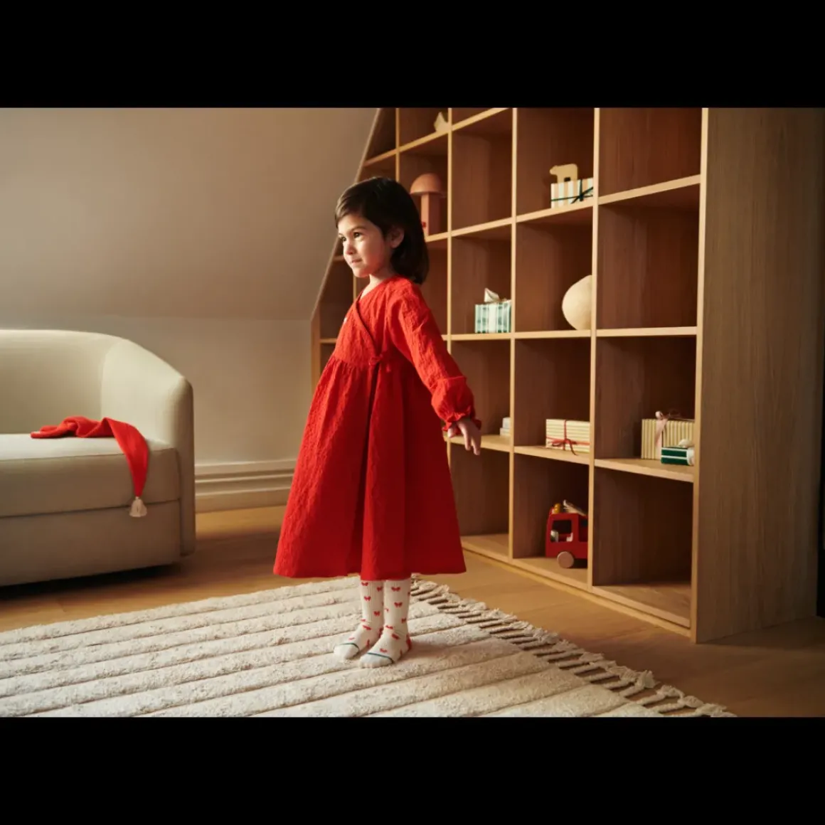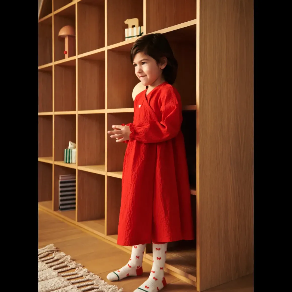 Lad dit barn snurre rundt og se skørtet hvirvle afsted på Cleo slå-om-kjolen. Den knitrende økologisk bomuld giver kjolen struktur, men er stadig super blød og behagelig at have på til alle højtidens aktiviter og når der skal danses om juletræet.