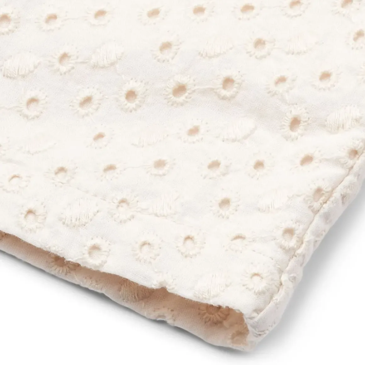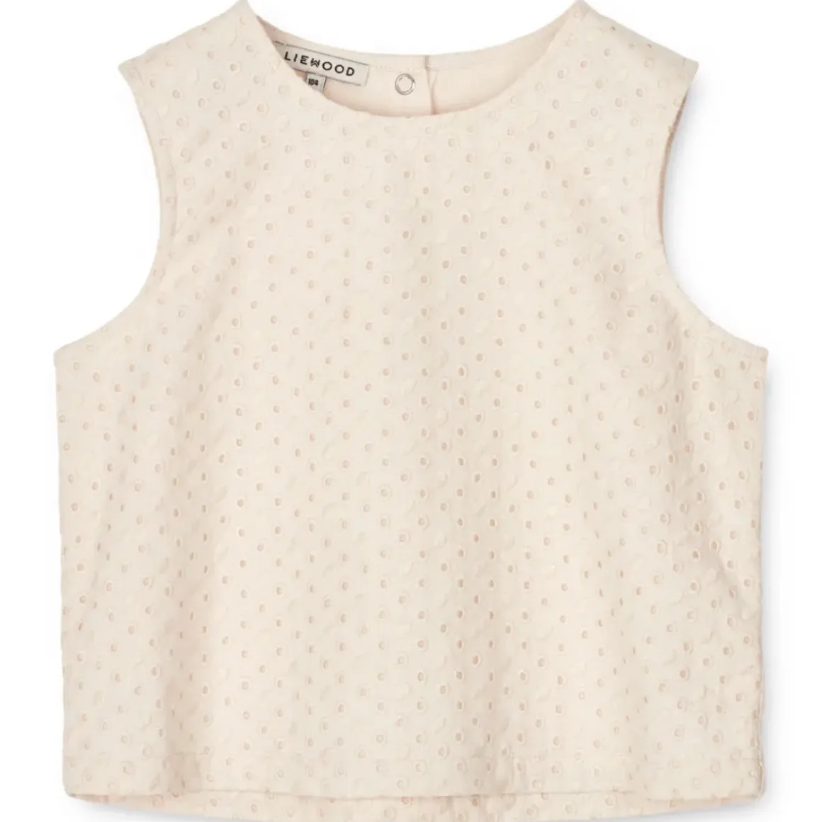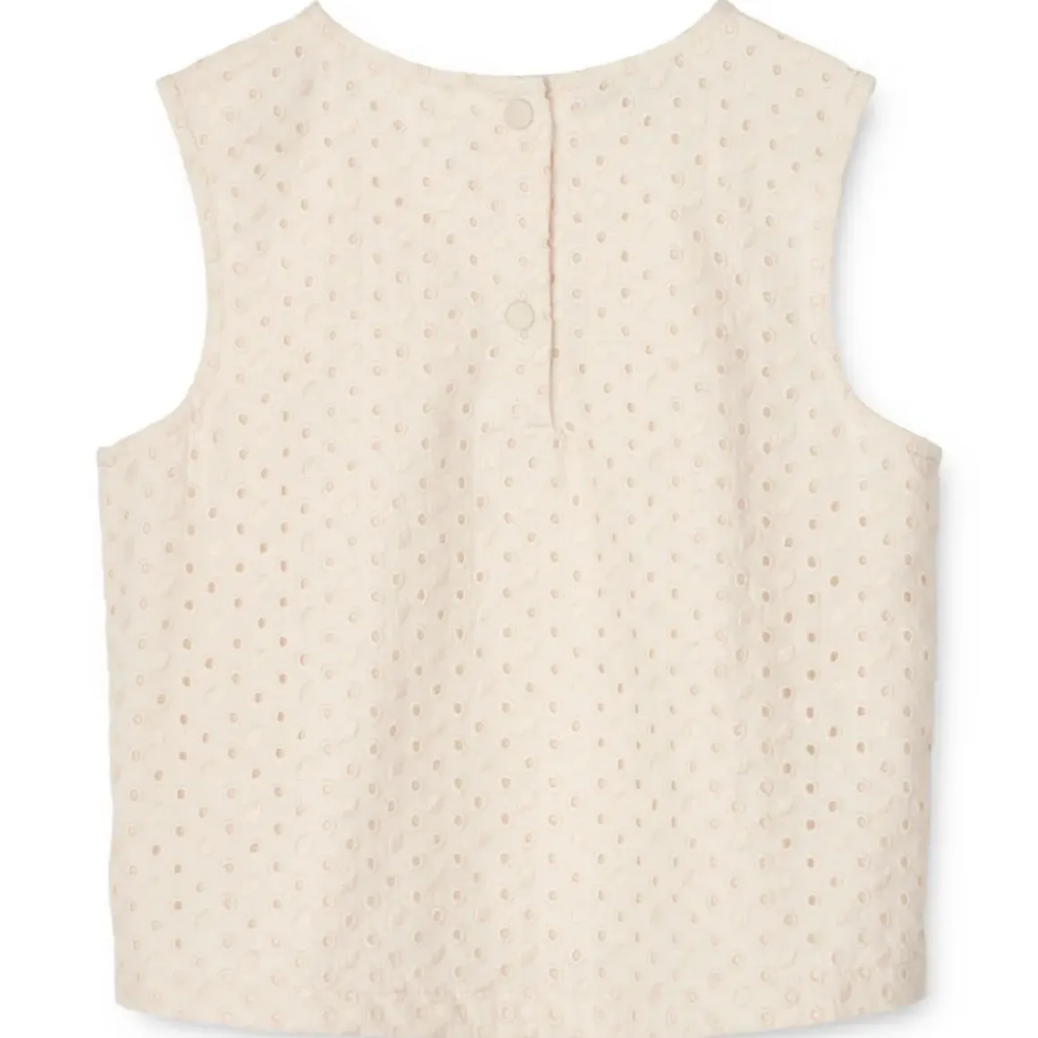 En klassisk sommertop i struktureret anglaise med et poetisk vintagepræg.