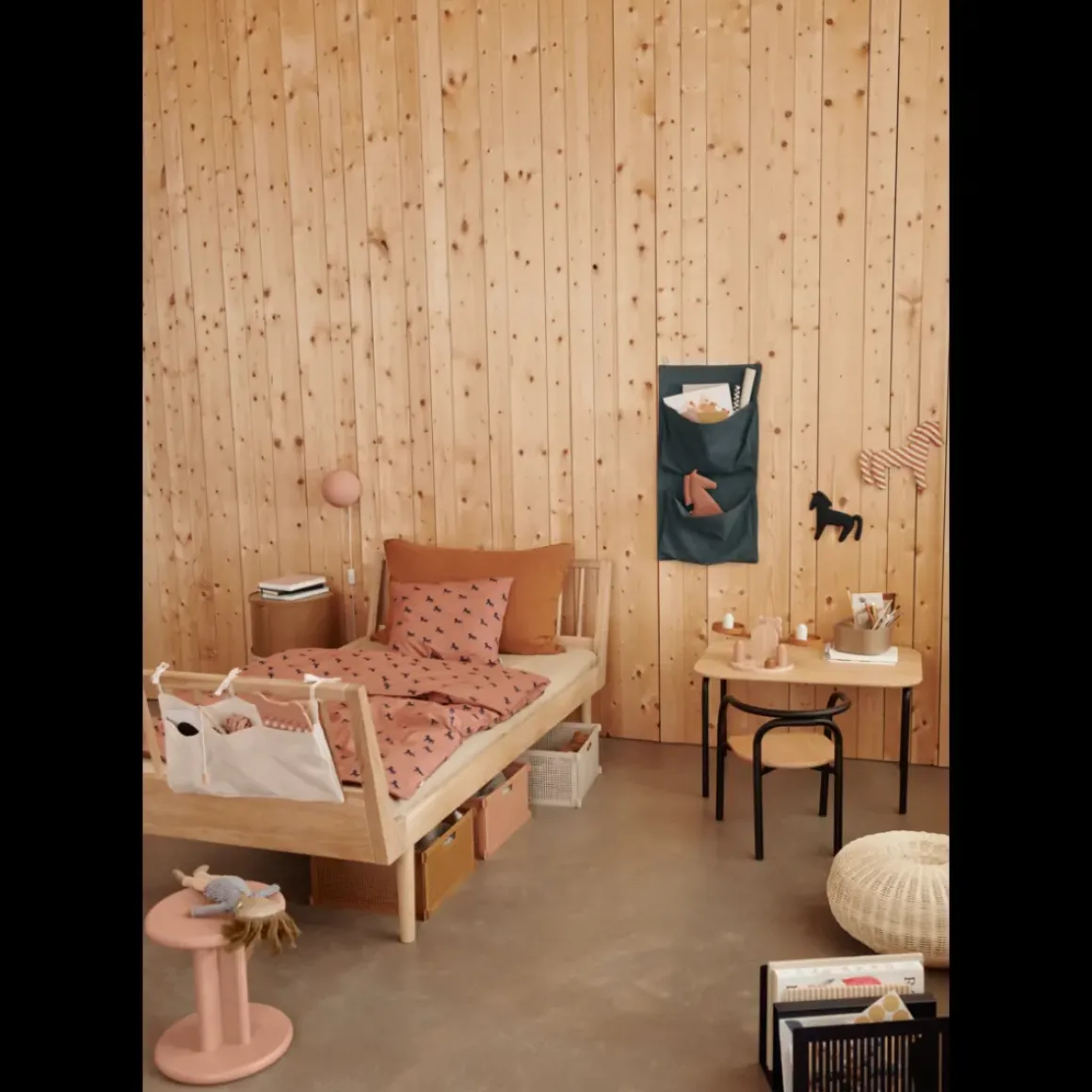 Haven er en dekorativ og praktisk måde at opbevare yndlingsbøger, legetøj og tilbehør på. Denne taktile kanvasbeholder er fremstillet i 100 % økologisk bomuld og har små løkker af bomuldssnor, så den er nem at hænge op på væggen.