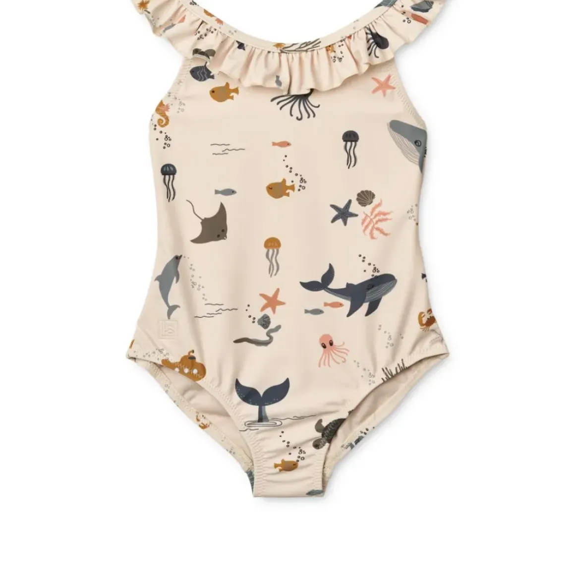 Kallie-badedragten har en klassisk silhuet med en dekorativ flæse i halsudskæringen og et fint sommerinspireret print. Stoffet har UV-beskyttelse og hjælper med at skærme den tildækkede hud mod solens stråler imens dine børn plasker rundt i vandet.