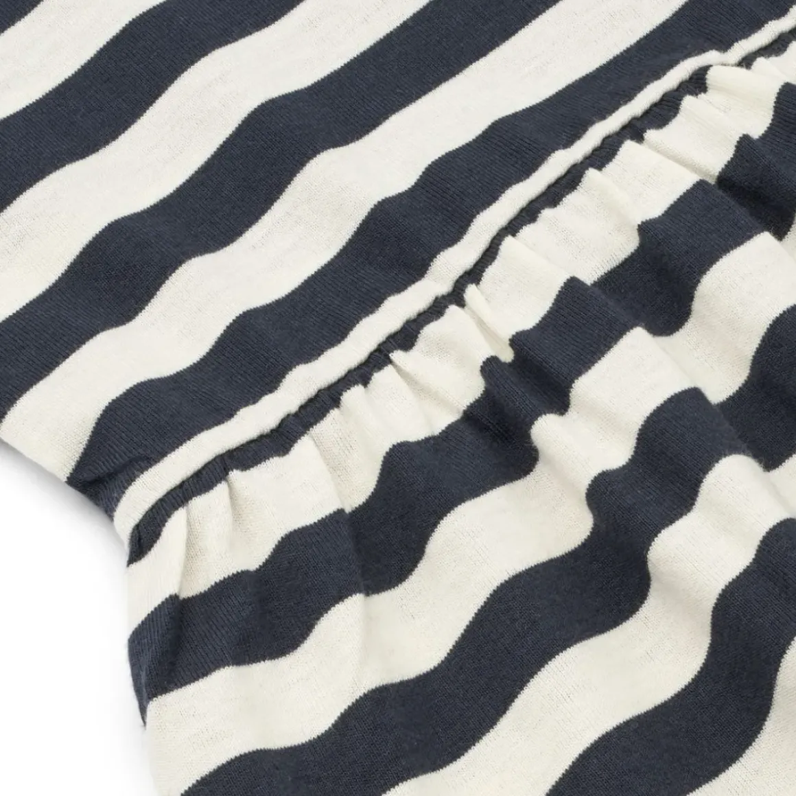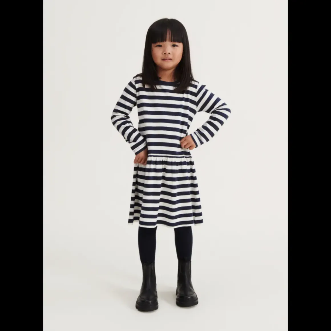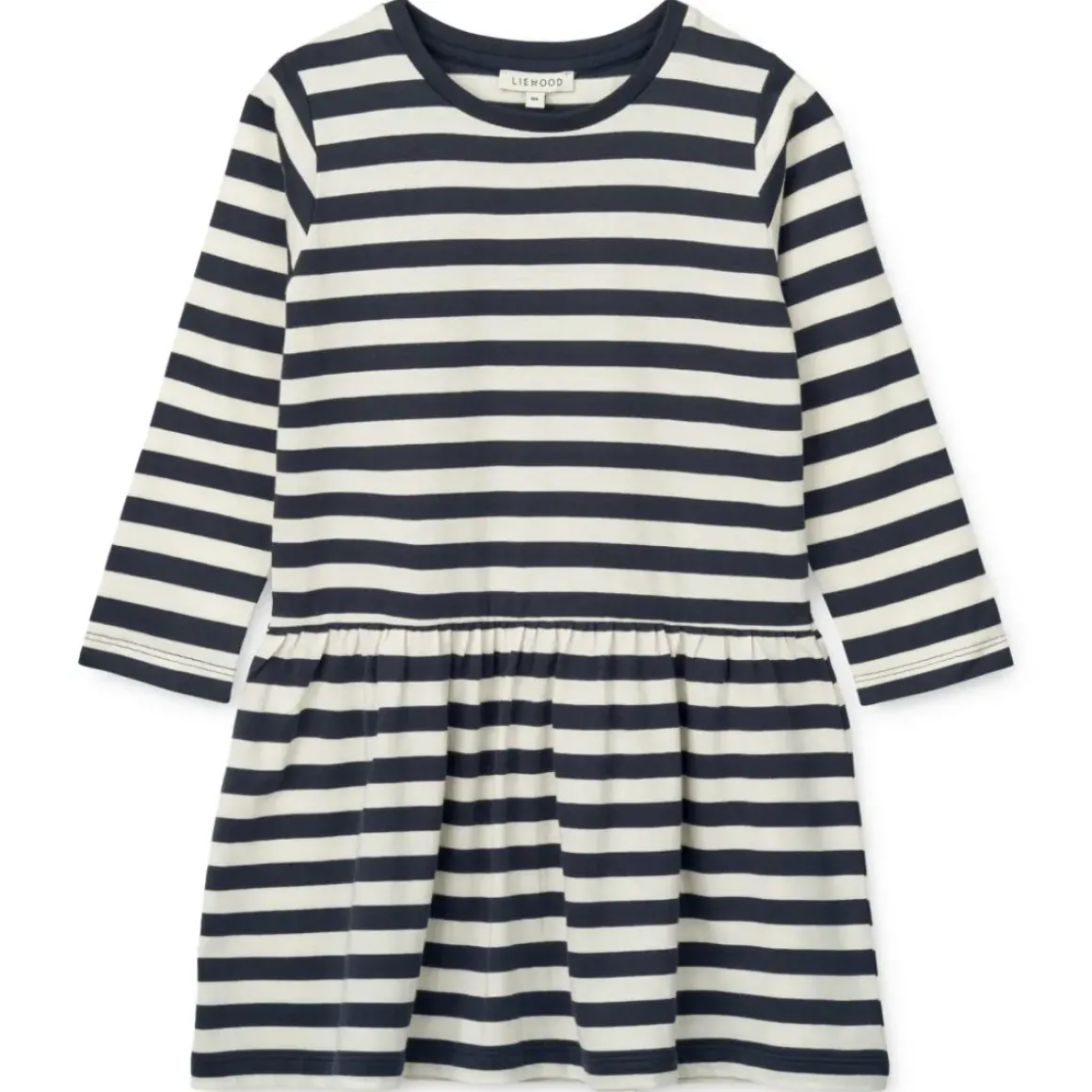 Denne Lima Is kjole i økologisk jersey er en blød og åndbar hverdagsfavorit. Rund, ribstrikket hals, rynket talje og lange ærmer giver et afslappet look, der ikke går på kompromis med komforten.