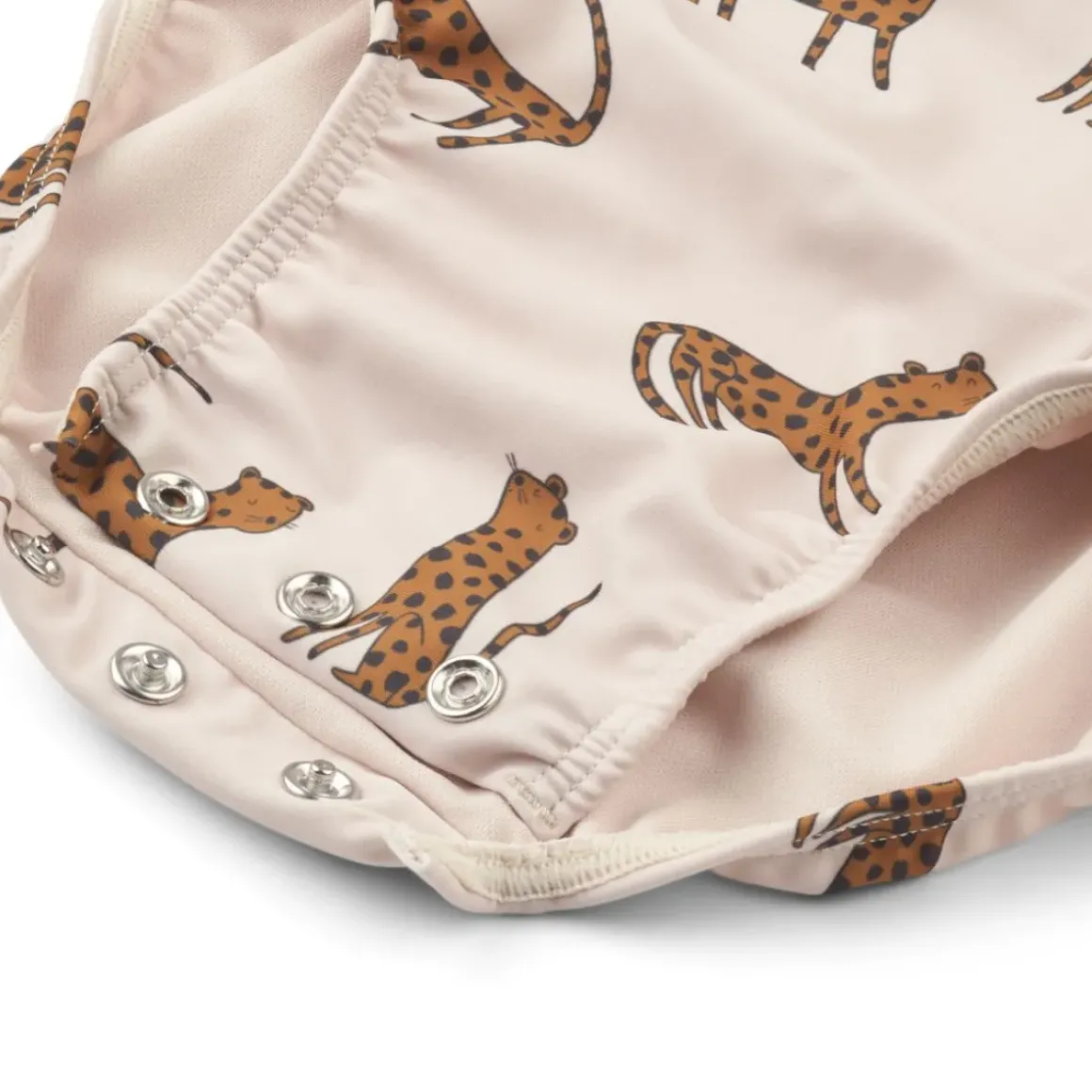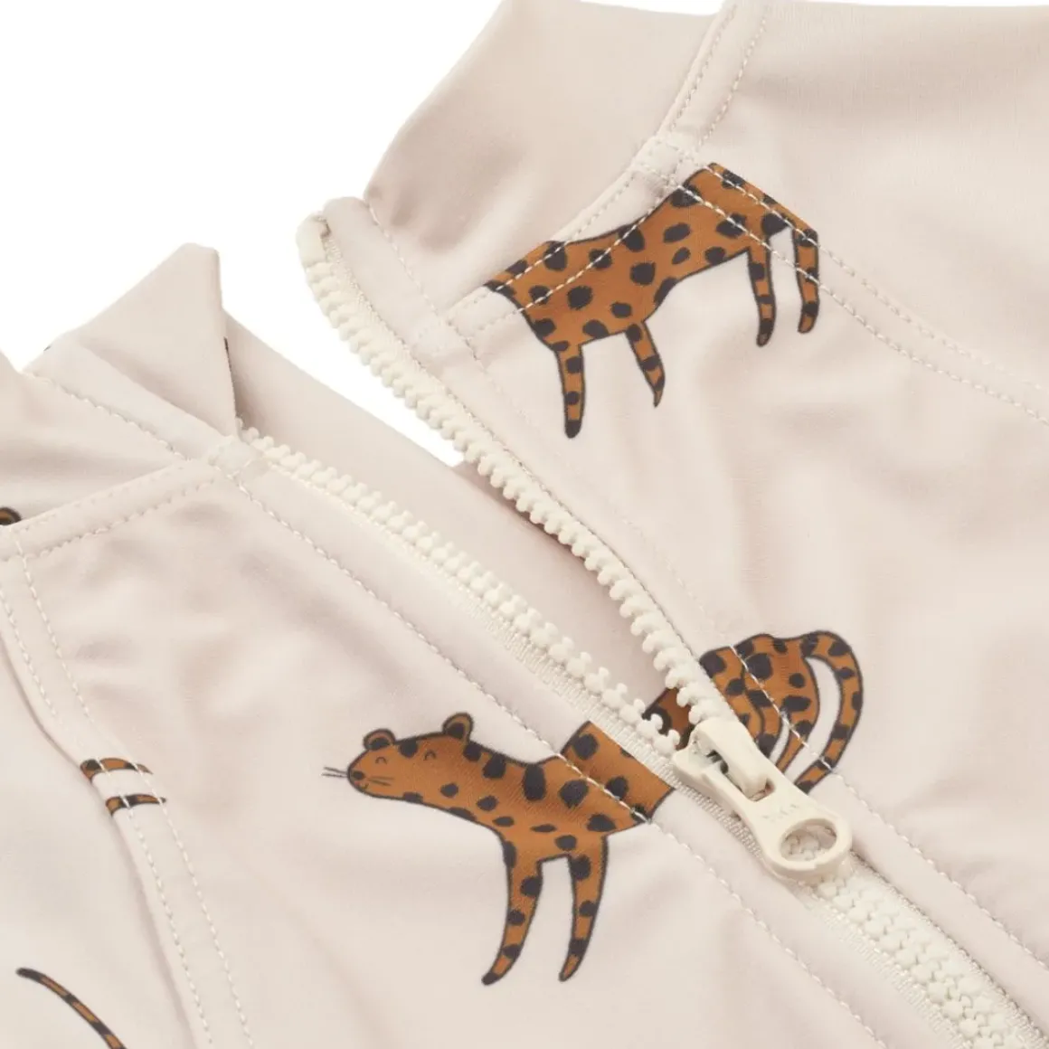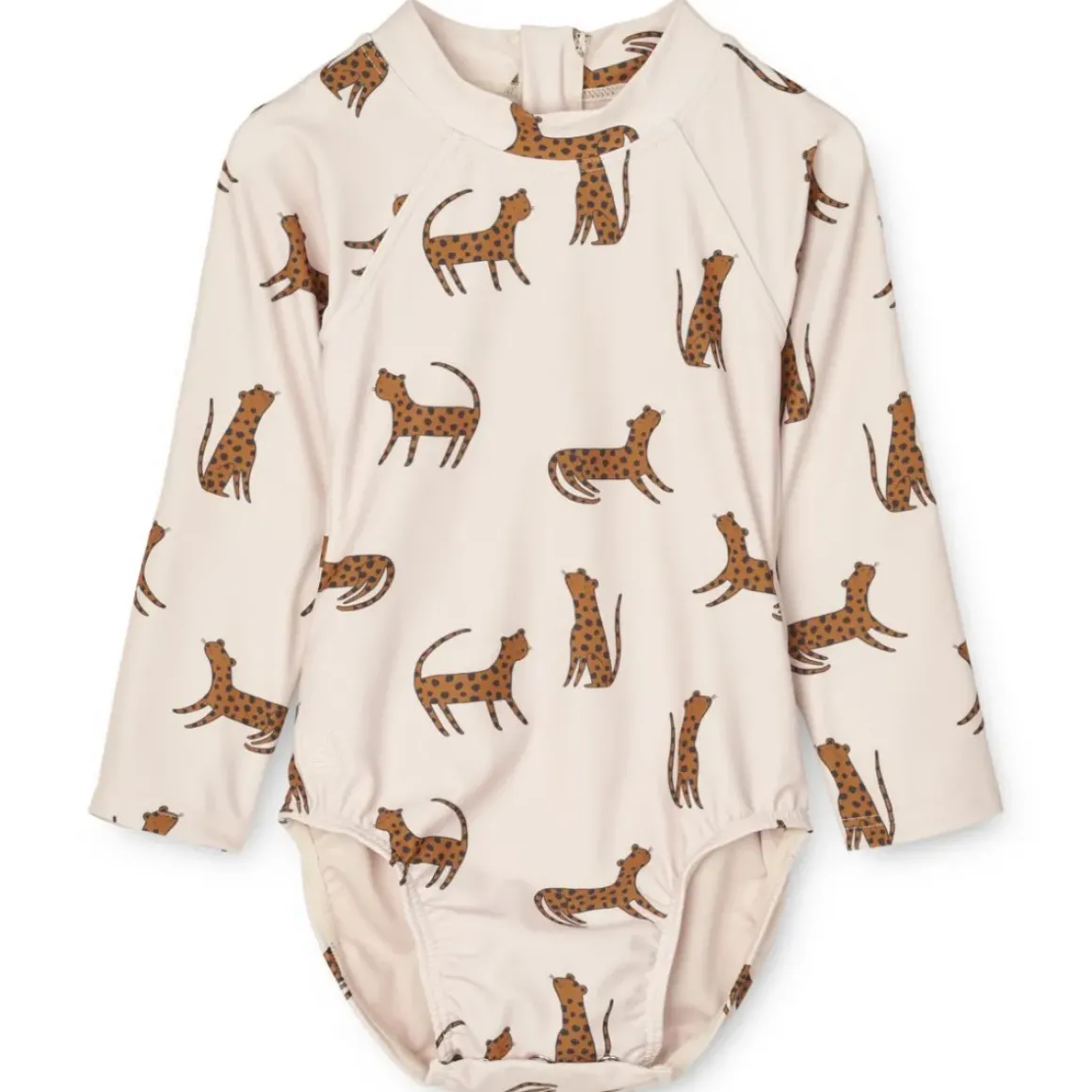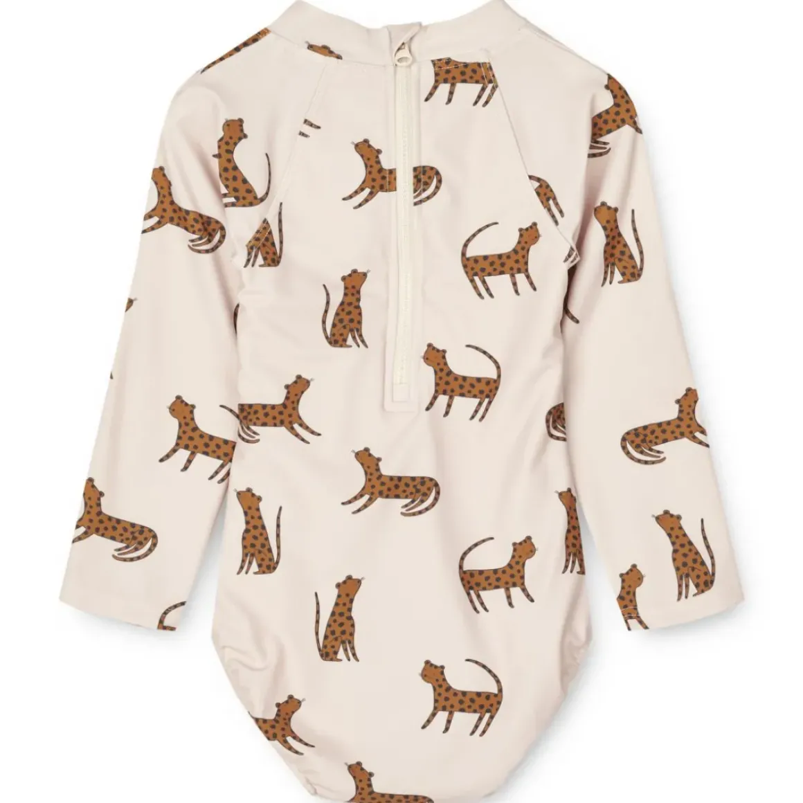 Maxime badedragten har et enkelt look og funktionelle detaljer, der gør den til en sand klassiker inden for babybadetøj. De lange ærmer, den høje krave og det UPF 40+ certificerede, strukturerede stof sikrer den ultimative solbeskyttelse, mens trykknaplukningen i skridtet og lynlåsen bagpå giver de ekstra nyttige funktioner, når man har med de yngste svømmere at gøre.