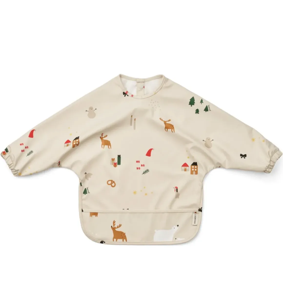 Let spiseforklæde med lange ærmer til små kommende madelskere. Elastikkerne ved ærmerne sikrer en tæt pasform og lommen foran sørger for at gribe spildt mad. Fremstillet i slidstærkt, genanvendt polyester gør spiseforklædet nemt at rengøre samtidig med, at det kan foldes sammen og nemt opbevares derhjemme eller når I er på farten.
