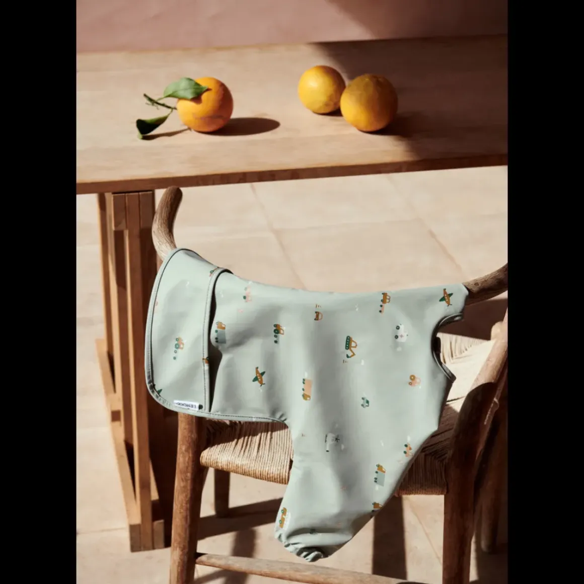 Let spiseforklæde med lange ærmer til små kommende madelskere. Elastikkerne ved ærmerne sikrer en tæt pasform og lommen foran sørger for at gribe spildt mad. Fremstillet i slidstærkt, genanvendt polyester gør spiseforklædet nemt at rengøre samtidig med, at det kan foldes sammen og nemt opbevares derhjemme eller når I er på farten.