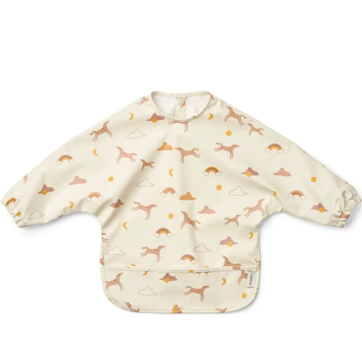 Let spiseforklæde med lange ærmer til små kommende madelskere. Elastikkerne ved ærmerne sikrer en tæt pasform og lommen foran sørger for at gribe spildt mad. Fremstillet i slidstærkt, genanvendt polyester gør spiseforklædet nemt at rengøre samtidig med, at det kan foldes sammen og nemt opbevares derhjemme eller når I er på farten.