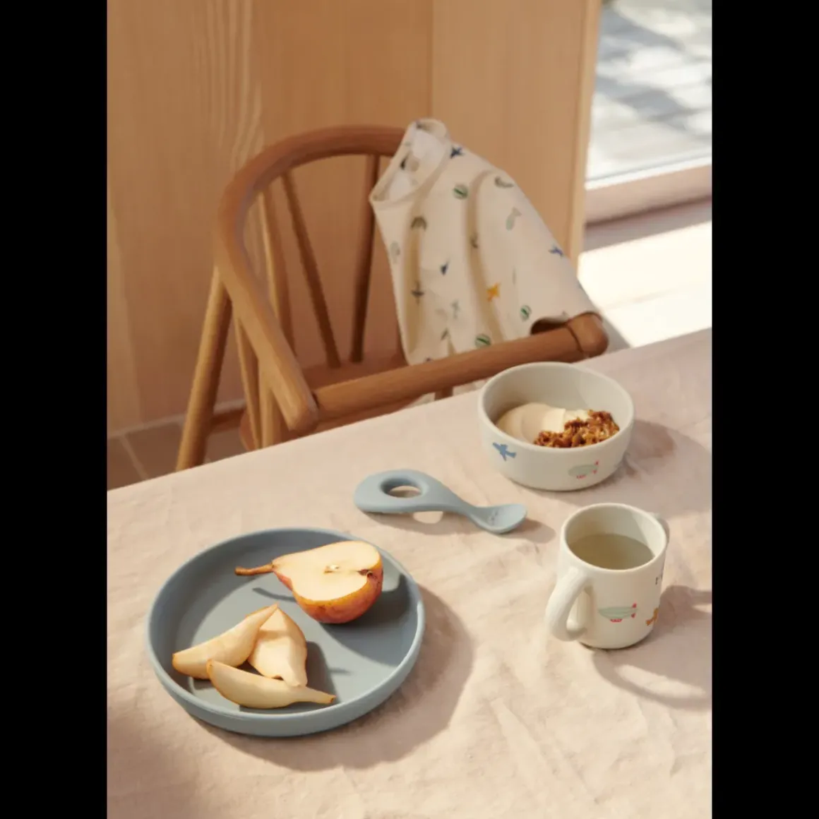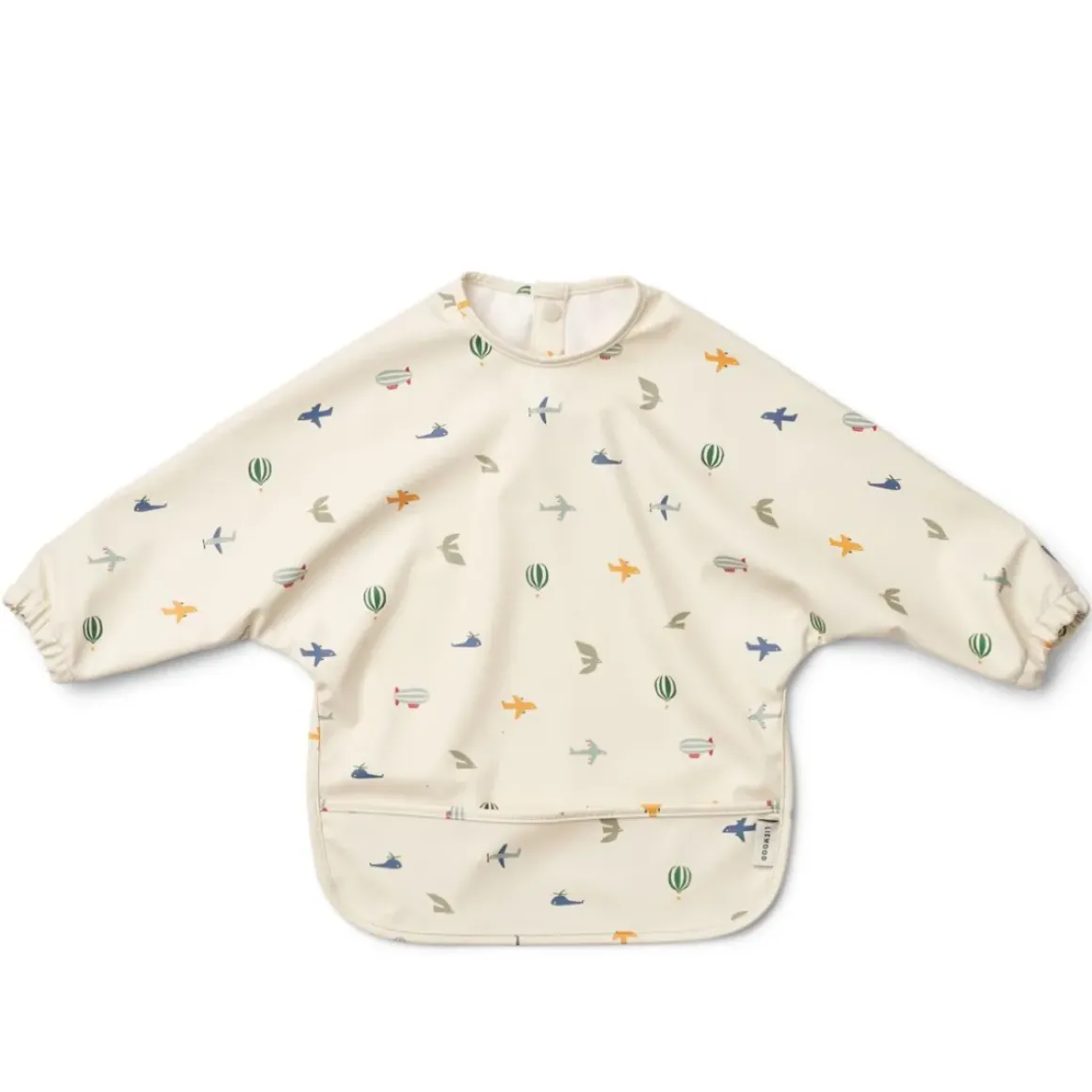 Let spiseforklæde med lange ærmer til små kommende madelskere. Elastikkerne ved ærmerne sikrer en tæt pasform og lommen foran sørger for at gribe spildt mad. Fremstillet i slidstærkt, genanvendt polyester gør spiseforklædet nemt at rengøre samtidig med, at det kan foldes sammen og nemt opbevares derhjemme eller når I er på farten.