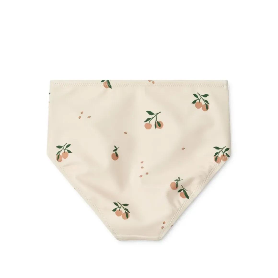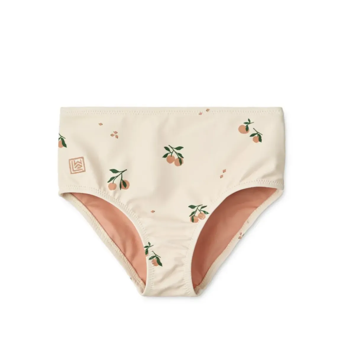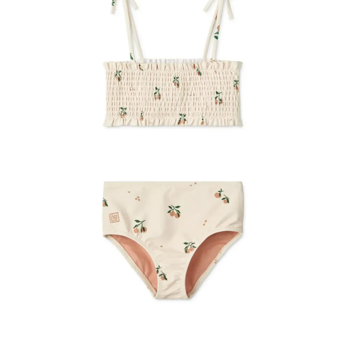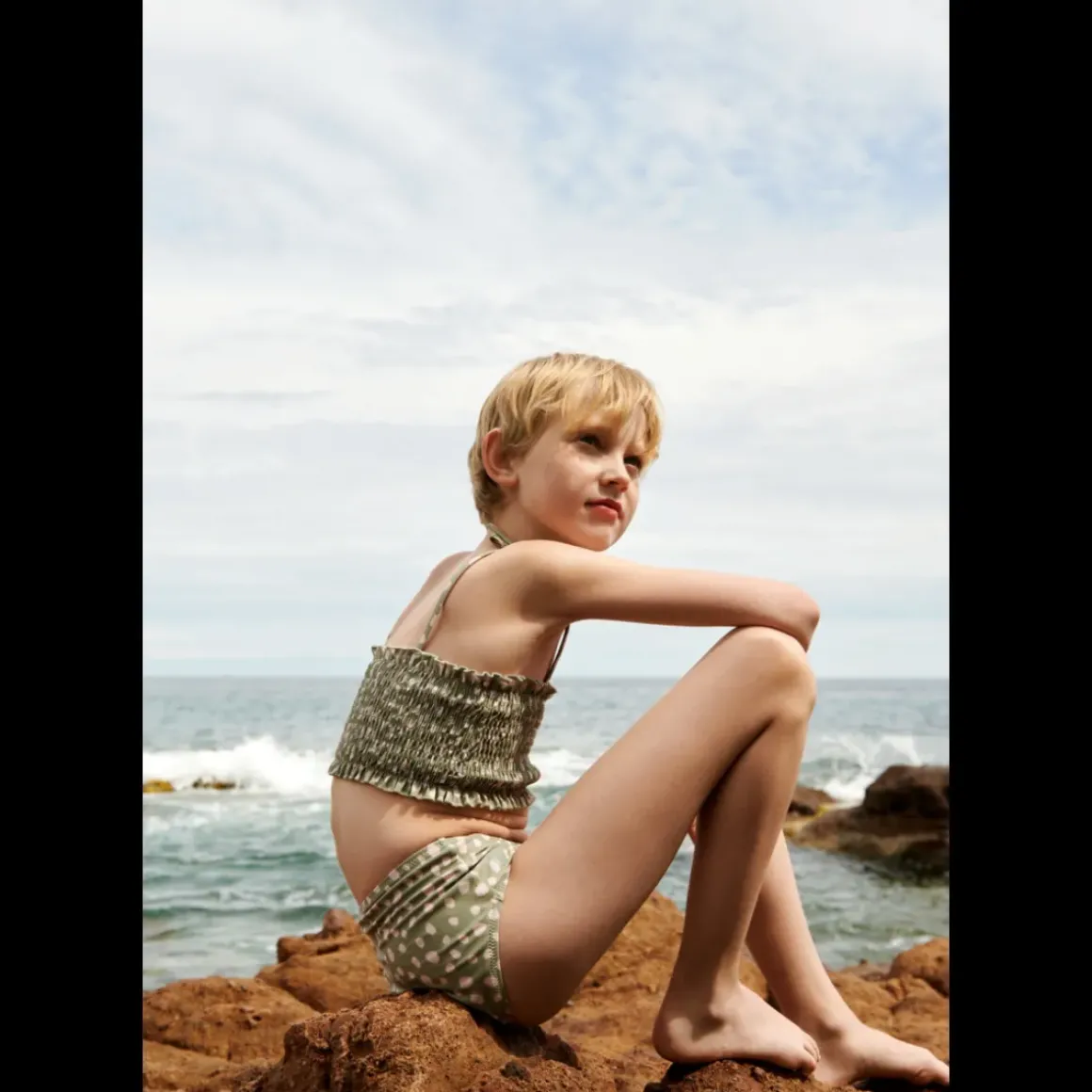Den todelte Mikaela-bikini kombinerer fine teksturer og detaljer med de selvbundne stropper og den mønstrede underdel. Den smocksyede top og de højtaljede klassiske bikinitrusser sikrer en god pasform, der er som skabt til svømmeturene og når dit barn går på opdagelse ved vandet.