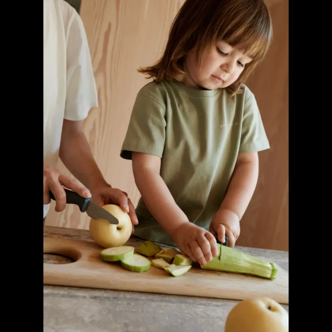 - Knivene kan skære igennem frugter og grøntsager, men er børnevenlige