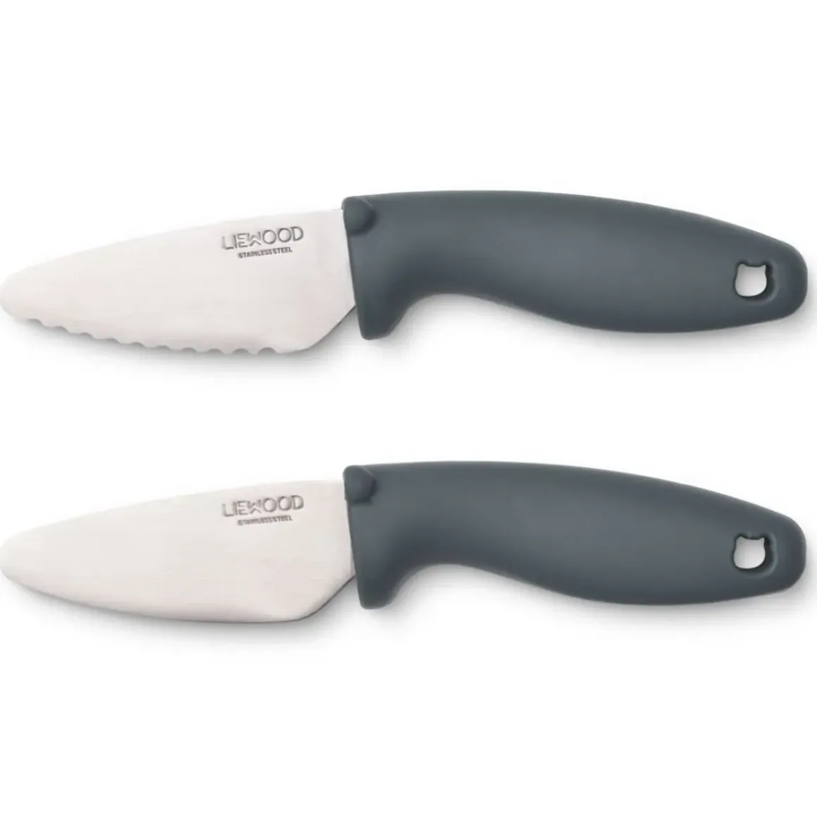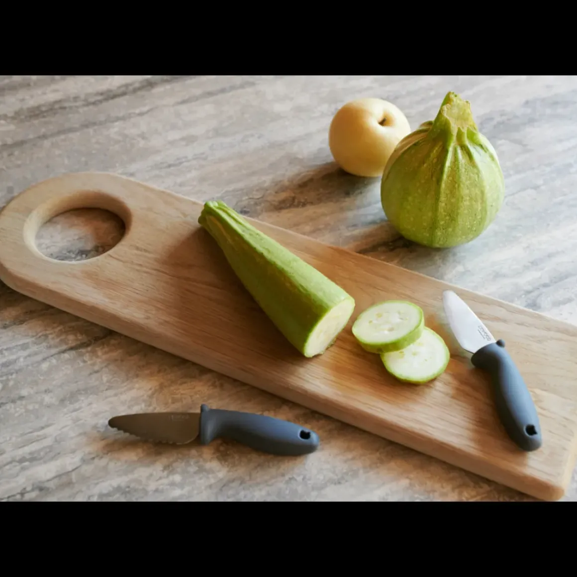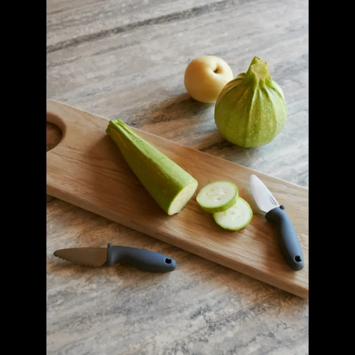 - Knivene kan skære igennem frugter og grøntsager, men er børnevenlige