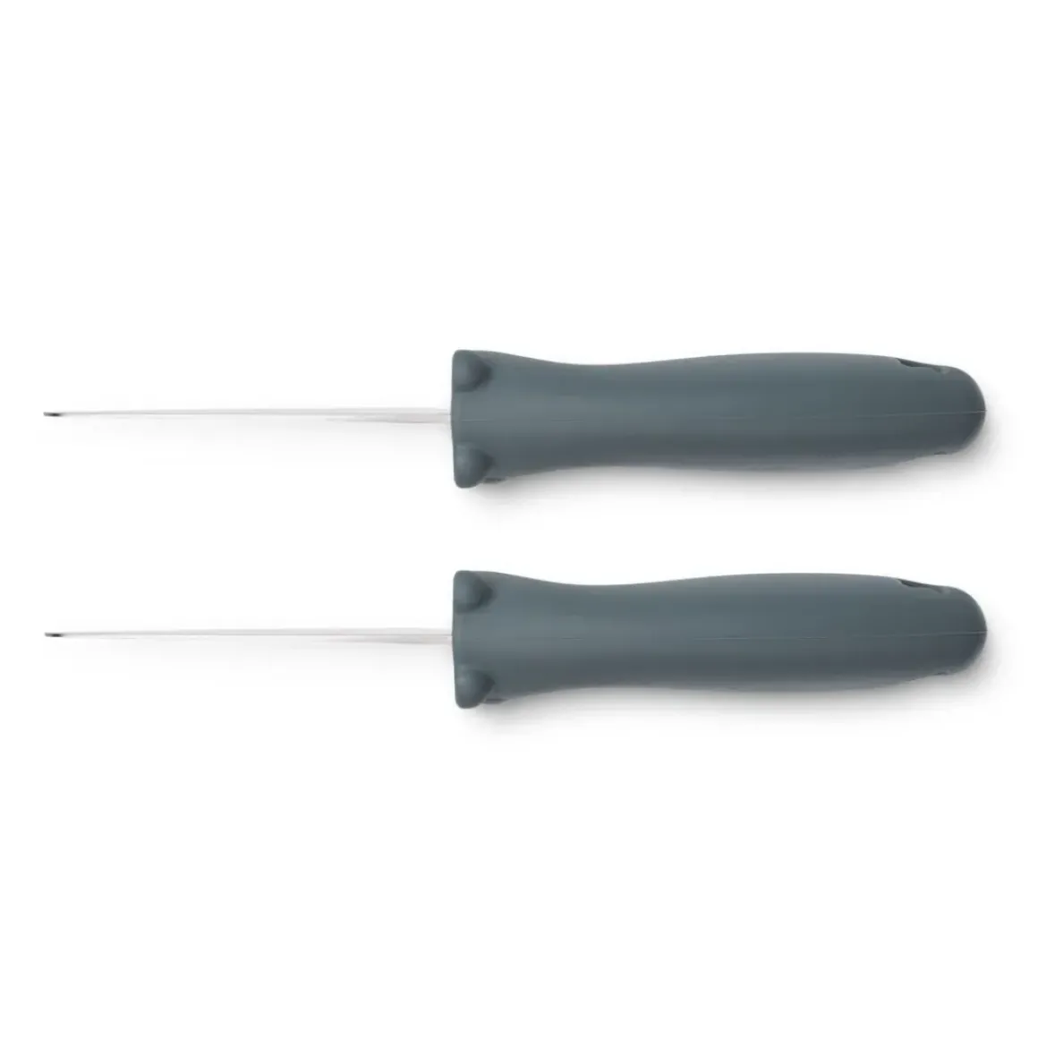 - Rustfrie stål blade og silikonehåndtag, der sikrer et godt greb