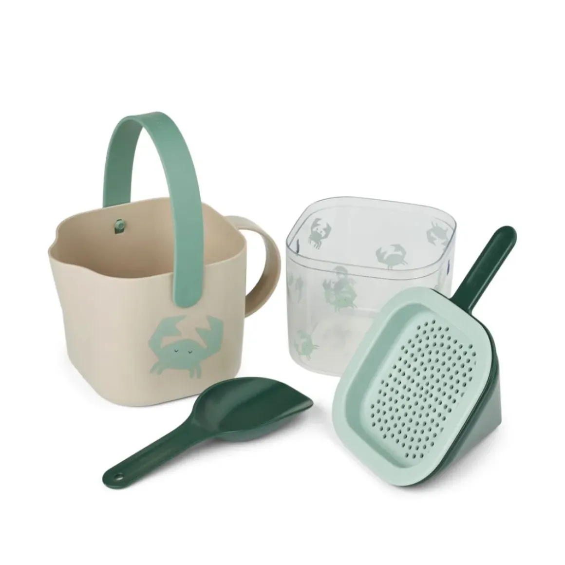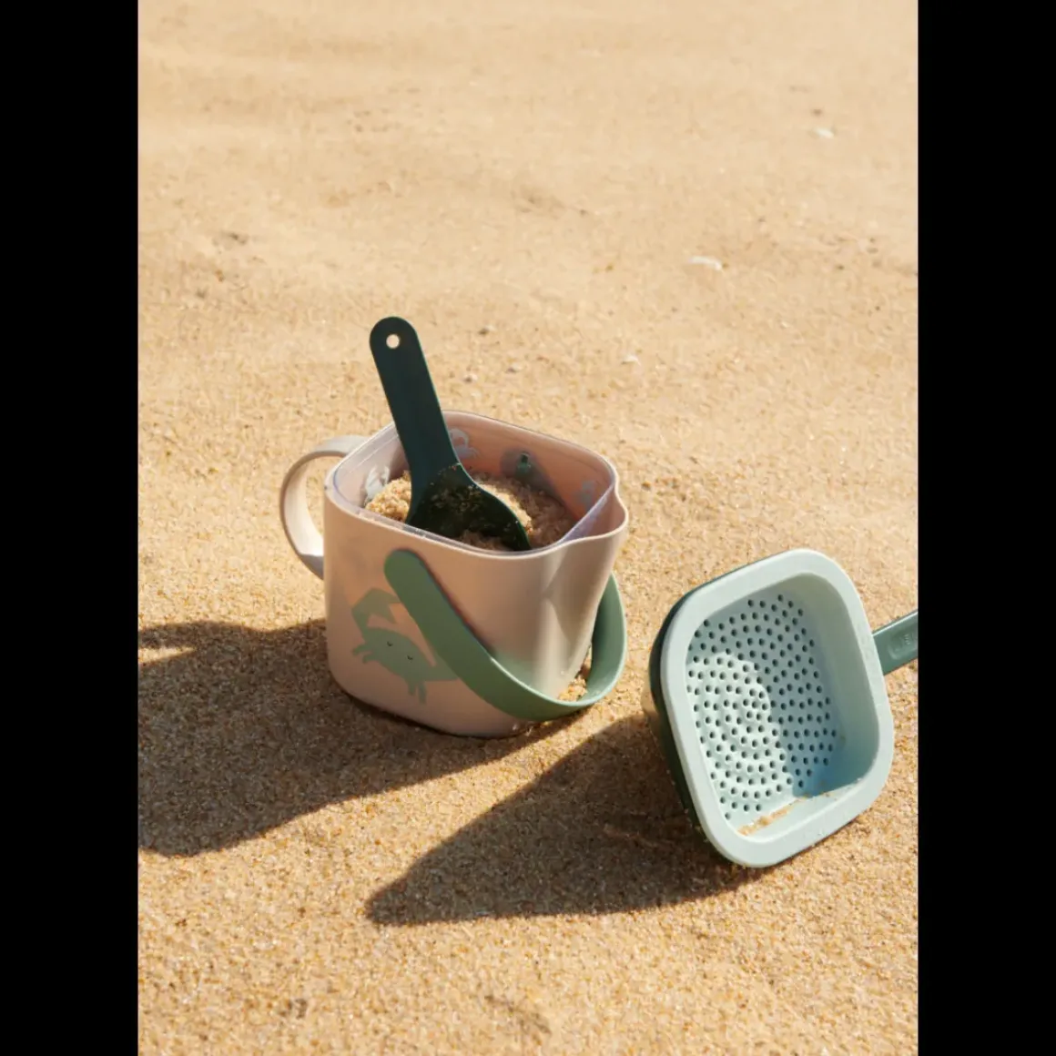 Das Sandspiel-Set ist perfekt für Strandabenteuer und der Natur auf der Spur. Es besteht aus einer Gießkanne, einem durchsichtigen Eimer, einem Trichter, einer Schaufel und einem Sieb und ist ein Spiel für draußen, das die Neugier der Kleinen weckt.