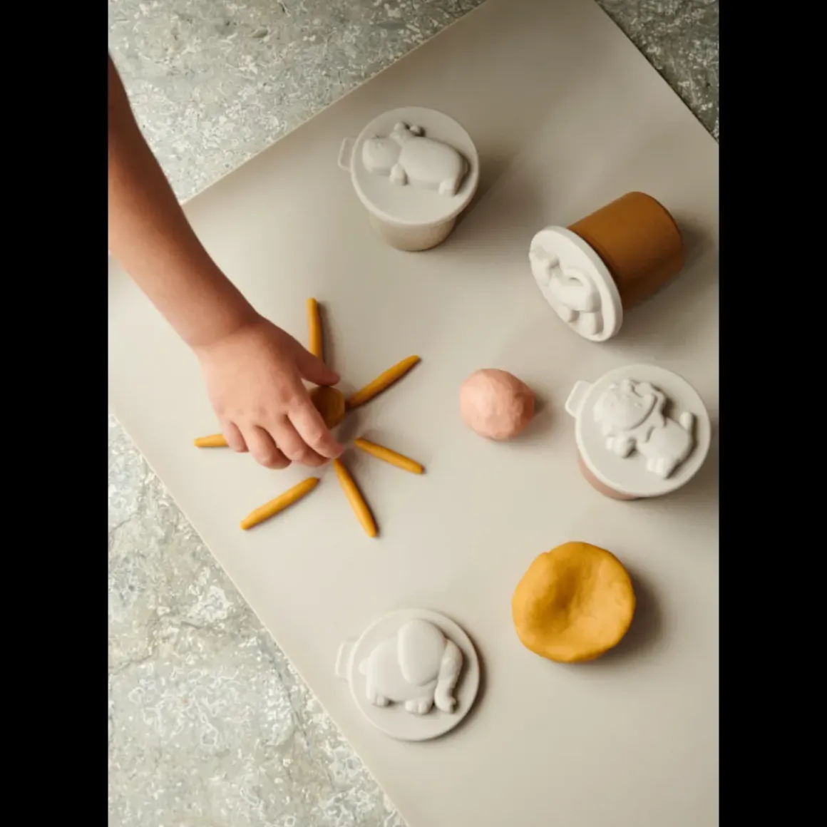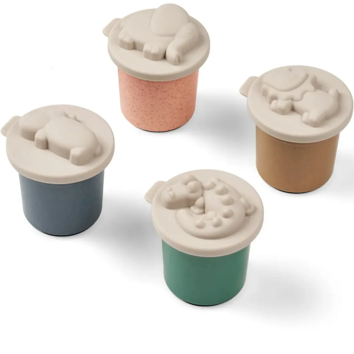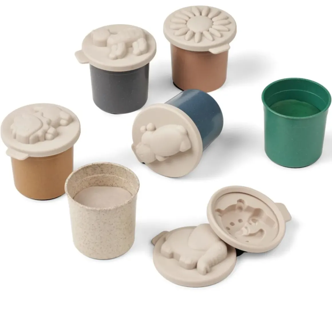 spande med forskelligt udformede låg, der også kan bruges som stempler og forme.