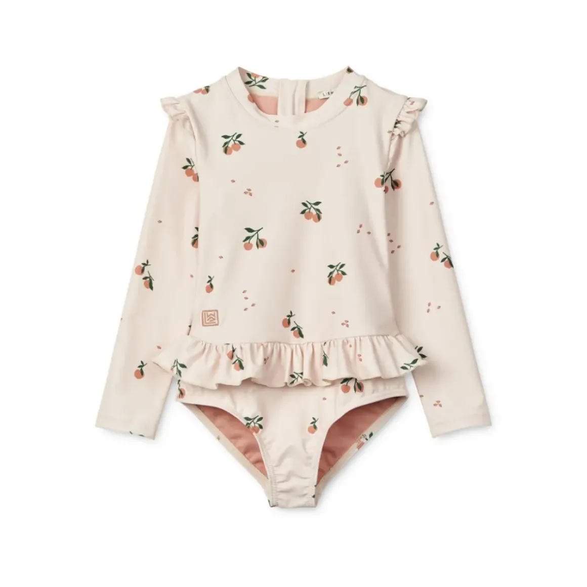 Sille-badedragten kombinerer et fint udtryk med UV-beskyttelse til sjove familiestunder i og ved vandet. Med bølgende flæser på skuldre og i taljen og en praktisk lynlås bagpå.