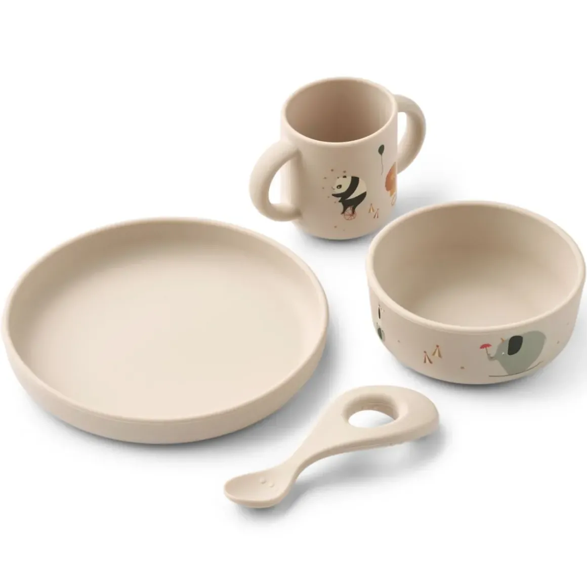 Alle vores måltidsfavorittter — samlet i ét praktisk sæt. Vivi servicesættet er fremstillet i holdbart silikone og er både brudsikkert og kan kommes i opvaskemaskinen. Sættet består af en kop, skål, tallerken og ske, der sikrer at dine små er klar til at udforske nye retter og smagsoplevelser.