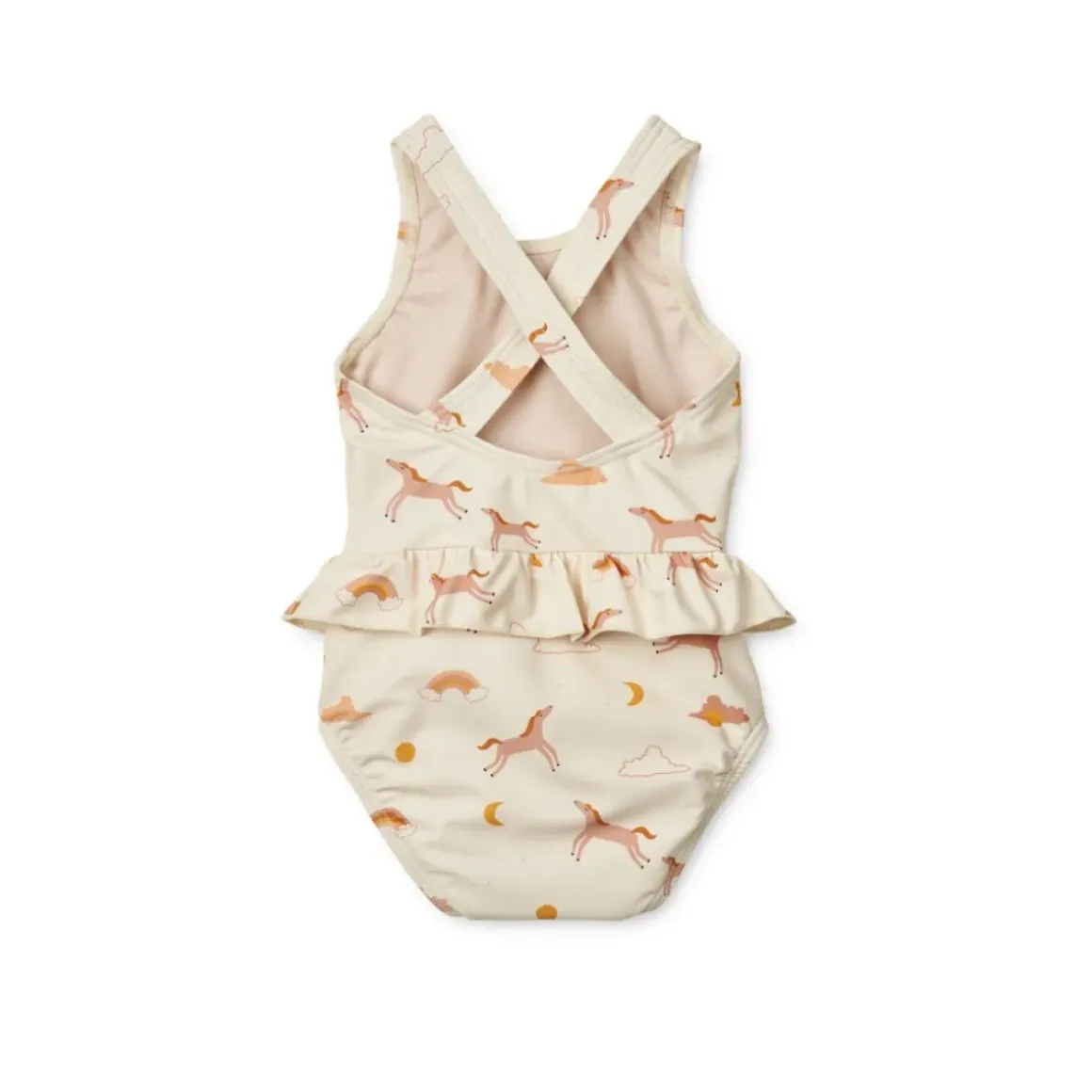 Amina babybadedragten har fine detaljer som flæserne ved taljen, krydsede stropper bagpå og praktiske trykknapper I bunden. Den beskytter den tildækkede hud mod solen når den lille øver sig i at plaske i vandet.