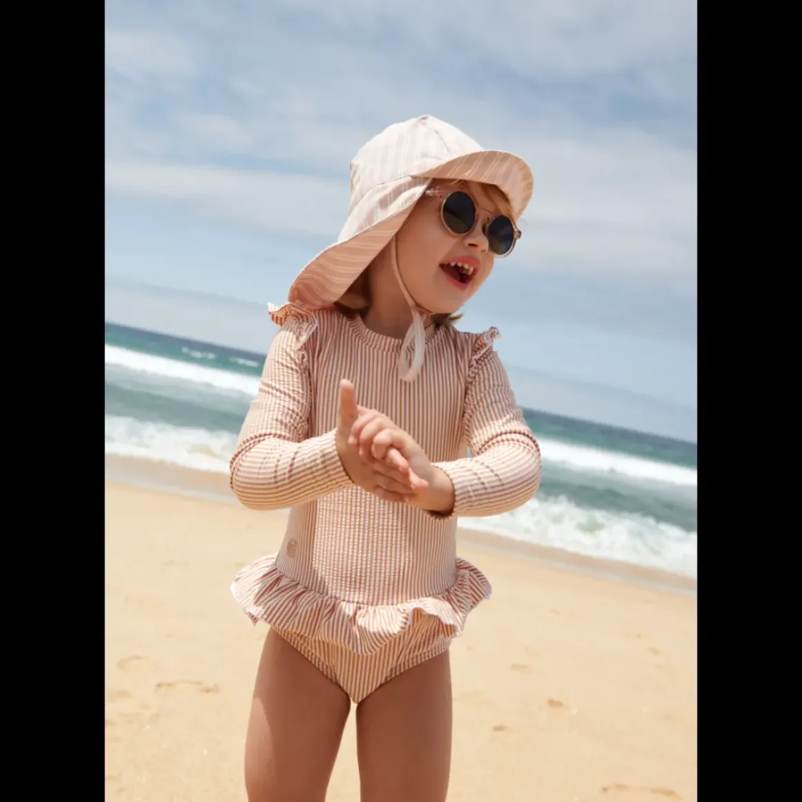 En smart og praktisk solhat til mindre børn med en ekstra lang skygge i nakken, der giver den bedst mulige solbeskyttelse. Den lette Cecilia solhat er fremstillet i økologisk bomuld, som gør den åndbar og behagelig selv på varme dage.