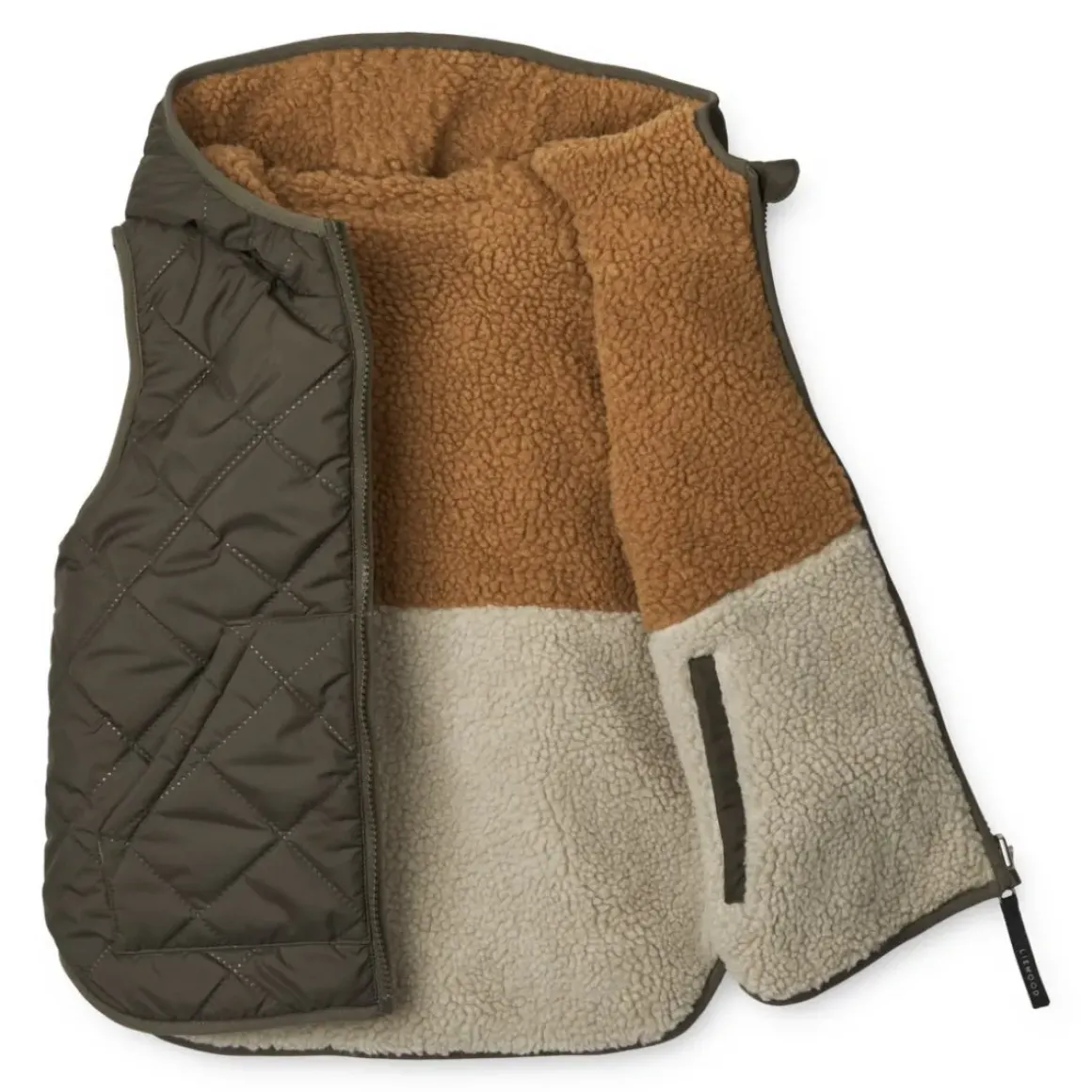 Komfortabel, praktisk og ideel til udendørs leg. Dina-vesten med hætte er fremstillet i 100 % genanvendt polyester og har blød og behagelig Sherpa-polstring. Du kan bruge vesten selvstændigt eller som et ekstra varmt lag under regntøj eller softshell-tøj fra LIEWOOD.