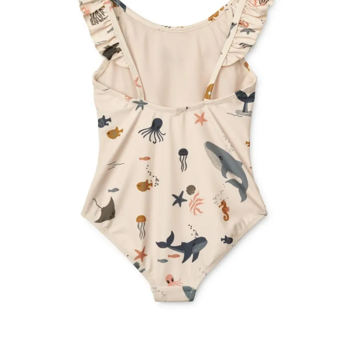 Kallie-badedragten har en klassisk silhuet med en dekorativ flæse i halsudskæringen og et fint sommerinspireret print. Stoffet har UV-beskyttelse og hjælper med at skærme den tildækkede hud mod solens stråler imens dine børn plasker rundt i vandet.