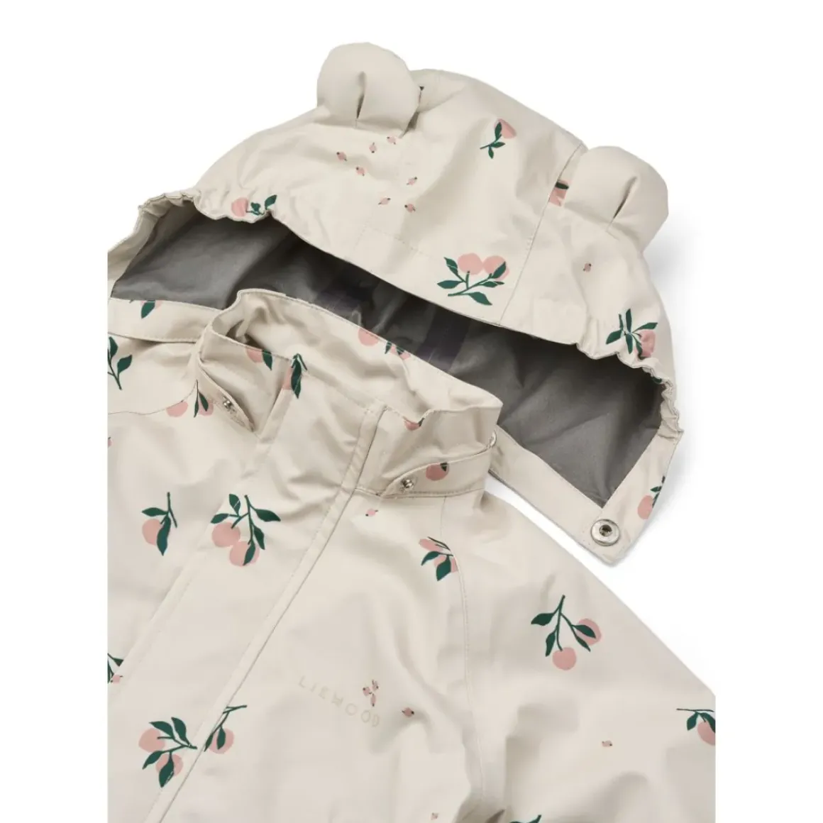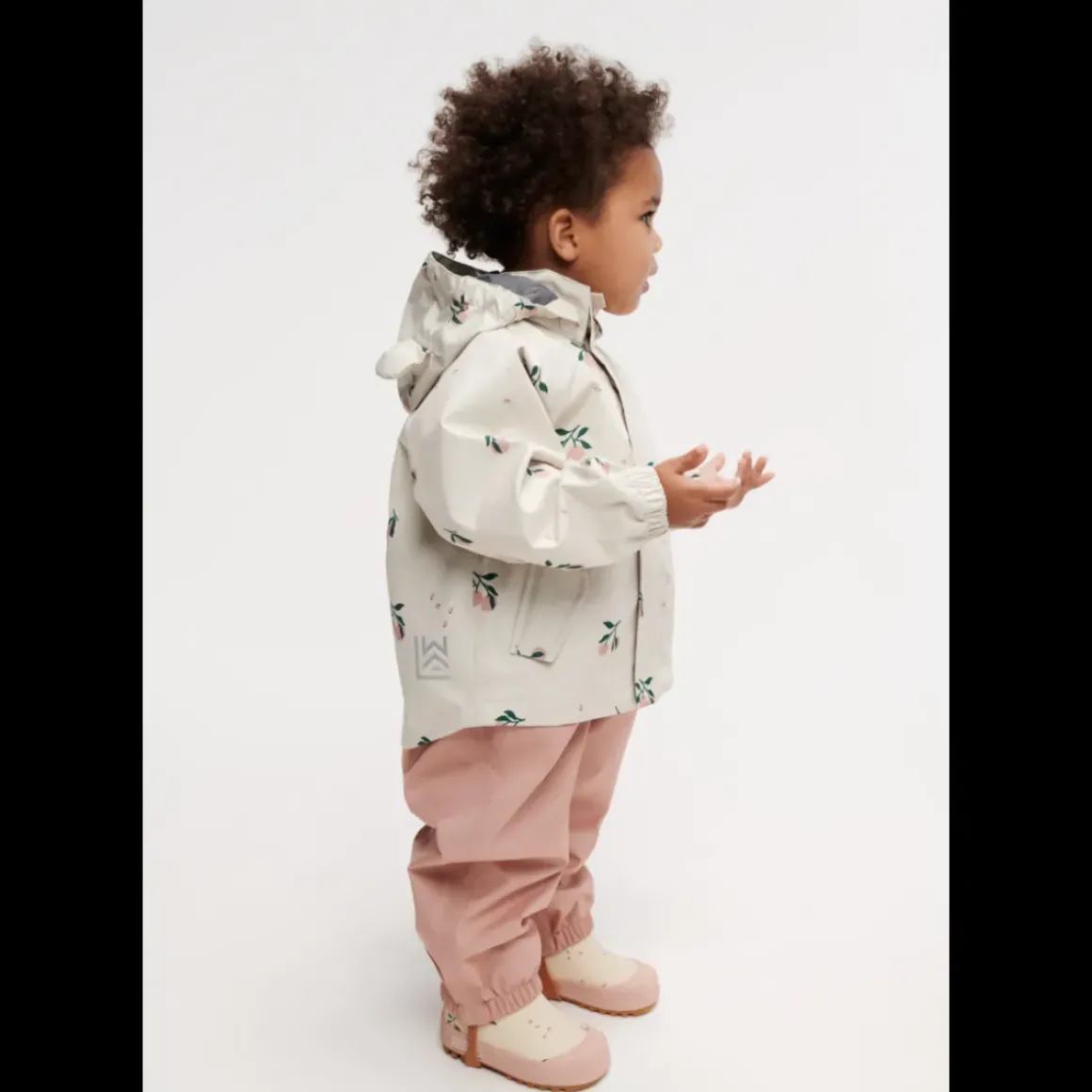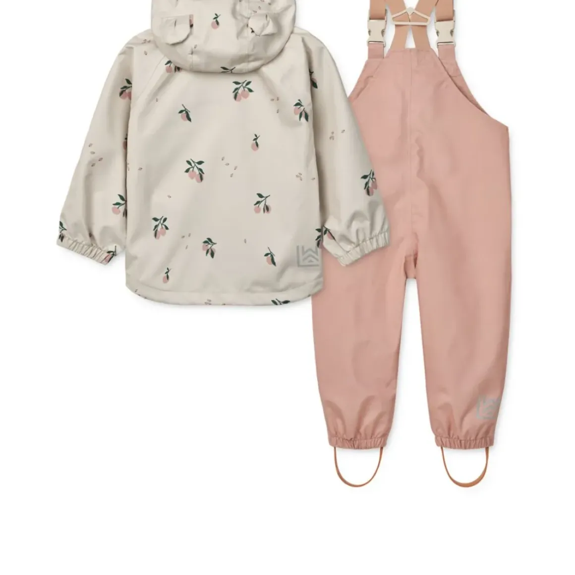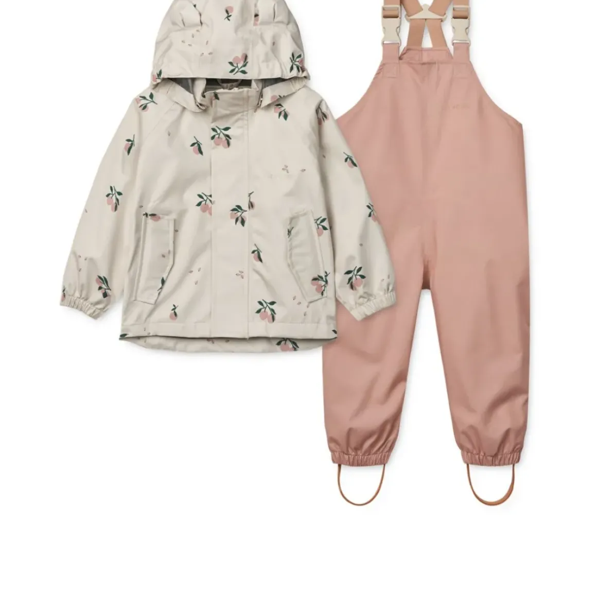 Vind- og vandtæt regnsæt med aftagelig hætte og justbare selebukser. Fremstillet i åndbart genanvendt softshelle stof i klassiske LIEWOOD-farver og prints. Jakken har en tildækket lynlås og tappede sømme, der sikrer, at dit barn forbliver varm og tør selv på årets vådeste dage.