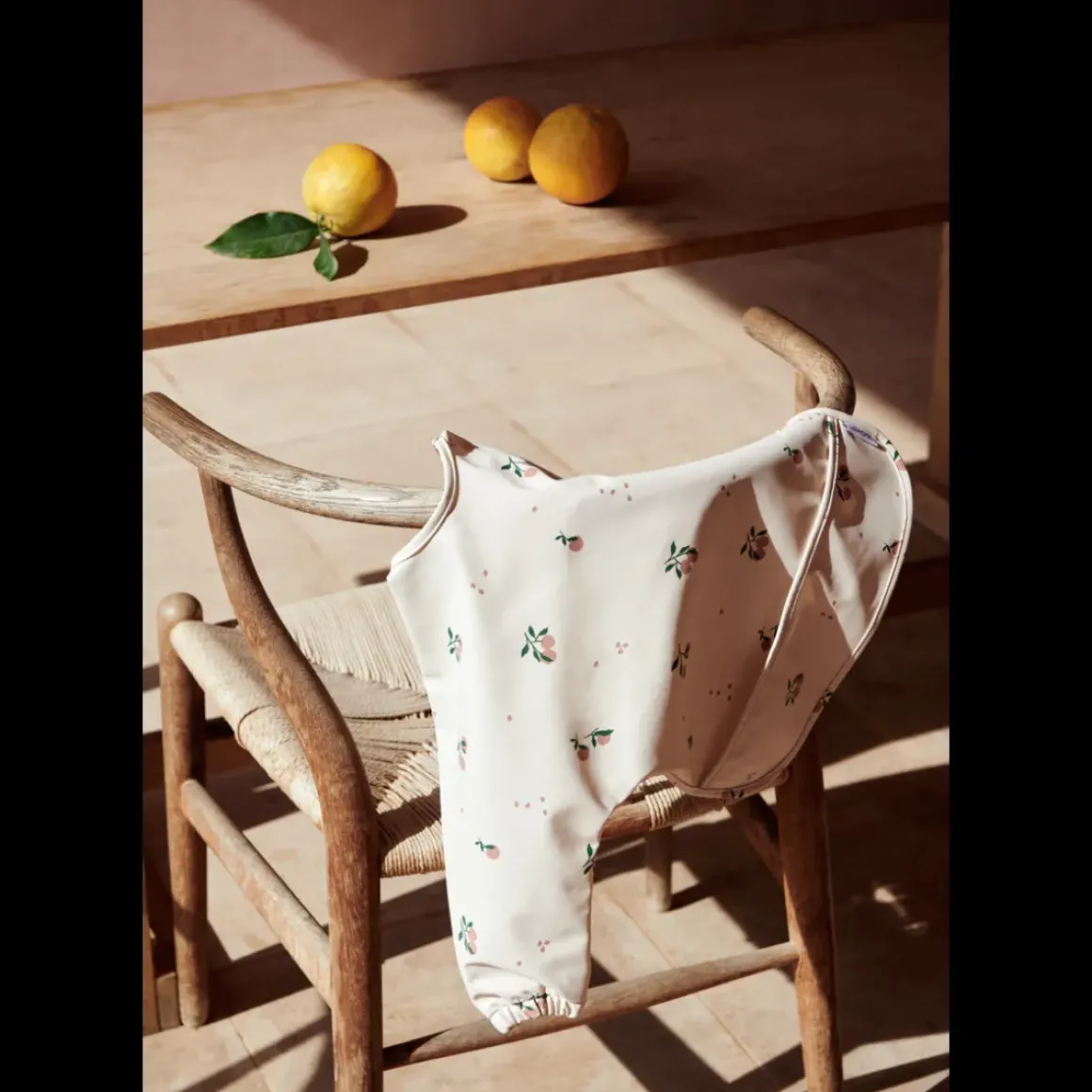 Let spiseforklæde med lange ærmer til små kommende madelskere. Elastikkerne ved ærmerne sikrer en tæt pasform og lommen foran sørger for at gribe spildt mad. Fremstillet i slidstærkt, genanvendt polyester gør spiseforklædet nemt at rengøre samtidig med, at det kan foldes sammen og nemt opbevares derhjemme eller når I er på farten.
