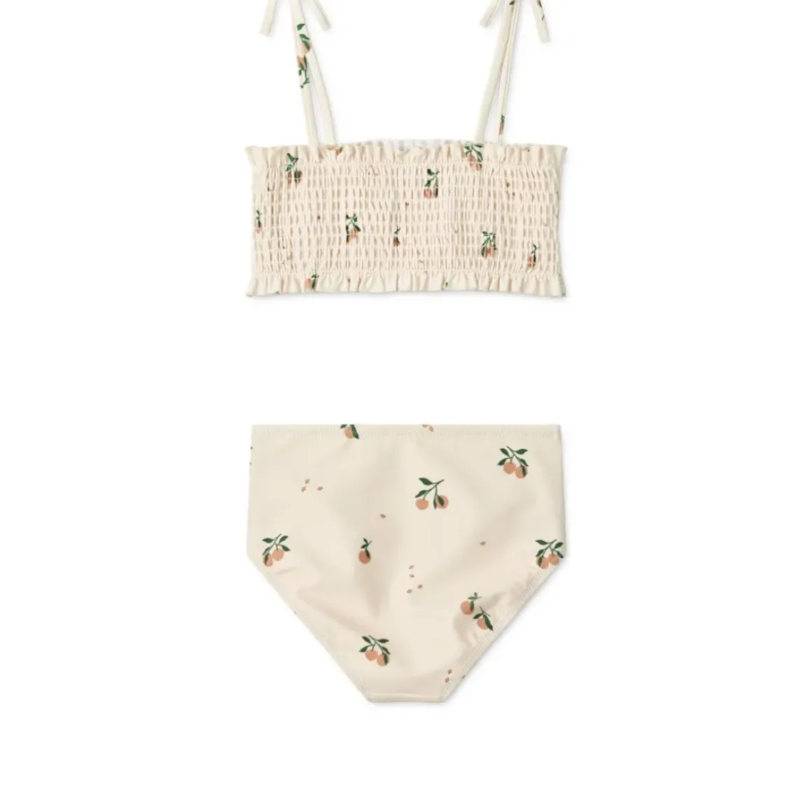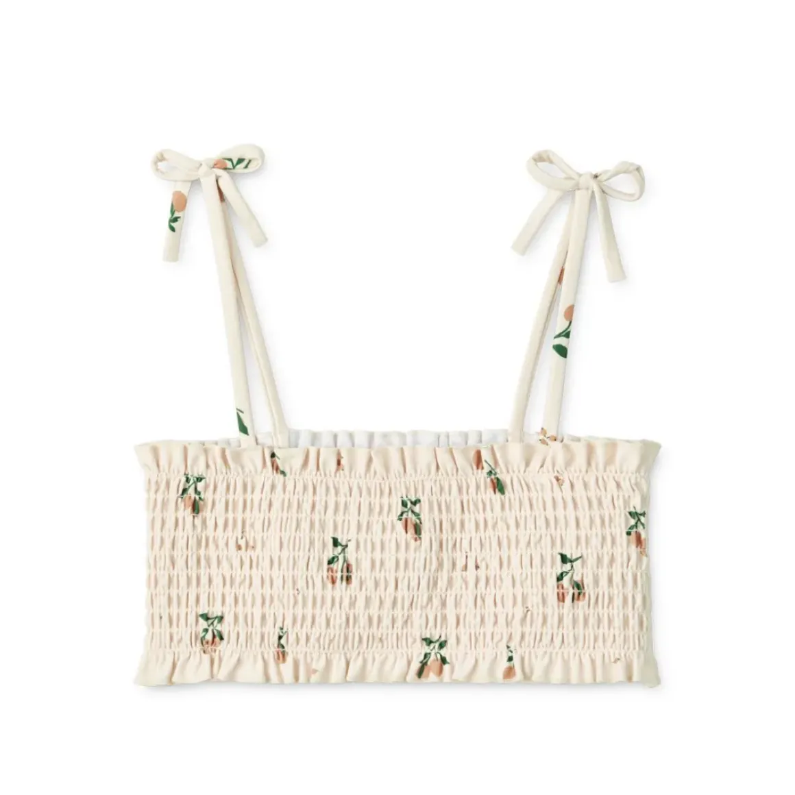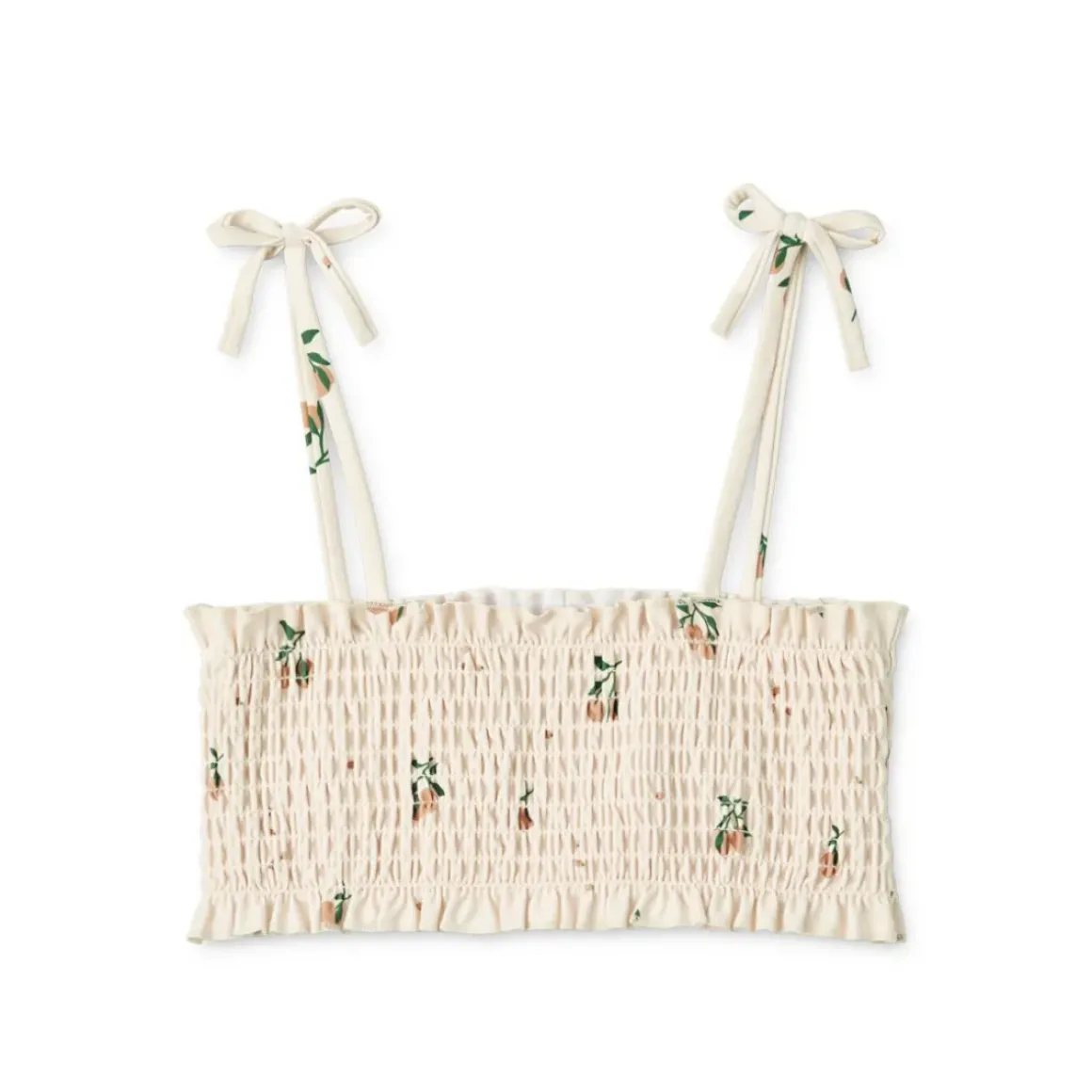 Den todelte Mikaela-bikini kombinerer fine teksturer og detaljer med de selvbundne stropper og den mønstrede underdel. Den smocksyede top og de højtaljede klassiske bikinitrusser sikrer en god pasform, der er som skabt til svømmeturene og når dit barn går på opdagelse ved vandet.