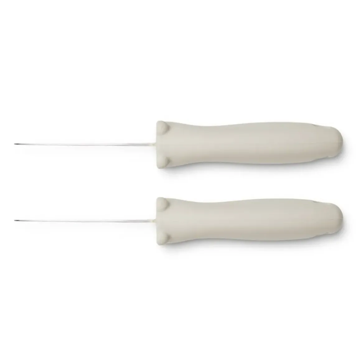 - Rustfrie stål blade og silikonehåndtag, der sikrer et godt greb