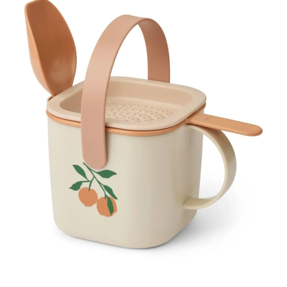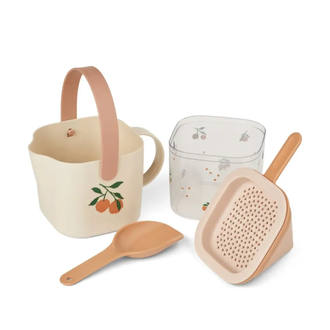 Das Sandspiel-Set ist perfekt für Strandabenteuer und der Natur auf der Spur. Es besteht aus einer Gießkanne, einem durchsichtigen Eimer, einem Trichter, einer Schaufel und einem Sieb und ist ein Spiel für draußen, das die Neugier der Kleinen weckt.